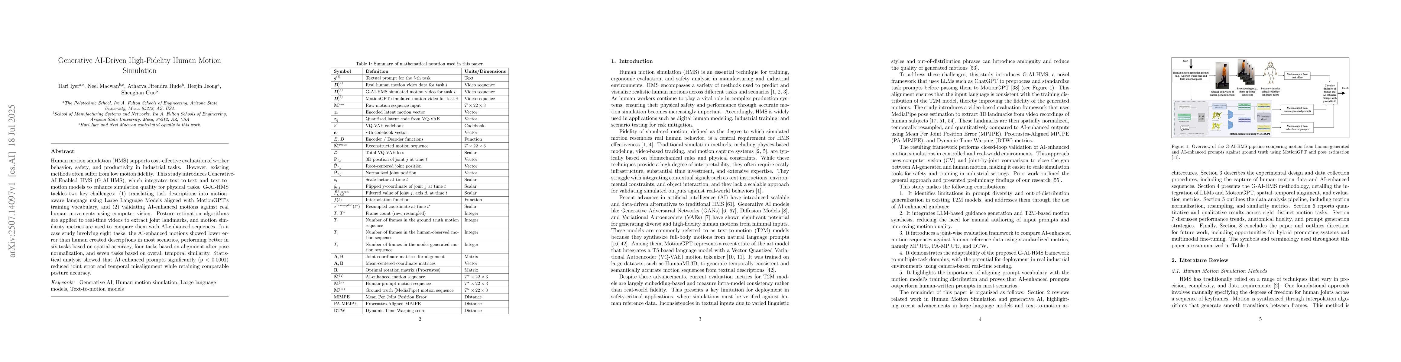 Human motion simulation (HMS) supports cost-effective evaluation of worker behavior, safety, and productivity in industrial tasks. However, existing methods often suffer from low motion fidelity. This study introduces Generative-AI-Enabled HMS (G-AI-HMS), which integrates text-to-text and text-to-motion models to enhance simulation quality for physical tasks. G-AI-HMS tackles two key challenges: (1) translating task descriptions into motion-aware language using Large Language Models aligned with MotionGPT's training vocabulary, and (2) validating AI-enhanced motions against real human movements using computer vision. Posture estimation algorithms are applied to real-time videos to extract joint landmarks, and motion similarity metrics are used to compare them with AI-enhanced sequences. In a case study involving eight tasks, the AI-enhanced motions showed lower error than human created descriptions in most scenarios, performing better in six tasks based on spatial accuracy, four tasks based on alignment after pose normalization, and seven tasks based on overall temporal similarity. Statistical analysis showed that AI-enhanced prompts significantly (p $<$ 0.0001) reduced joint error and temporal misalignment while retaining comparable posture accuracy.
