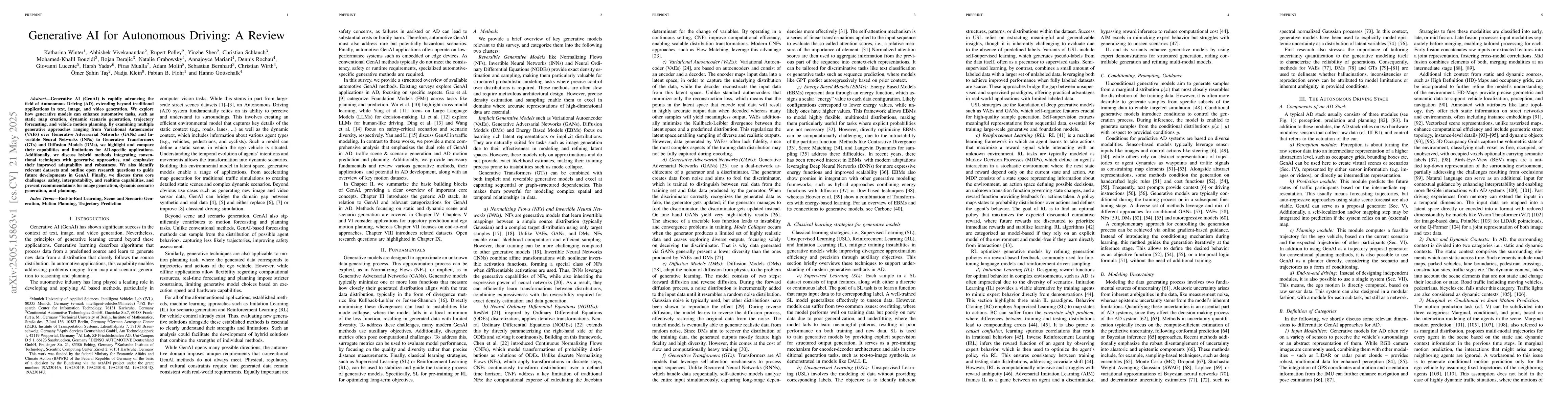 The paper provides a comprehensive review of generative AI models, including VAEs, GANs, INNs, GTs, and DMs, examining their capabilities and limitations for autonomous driving applications.