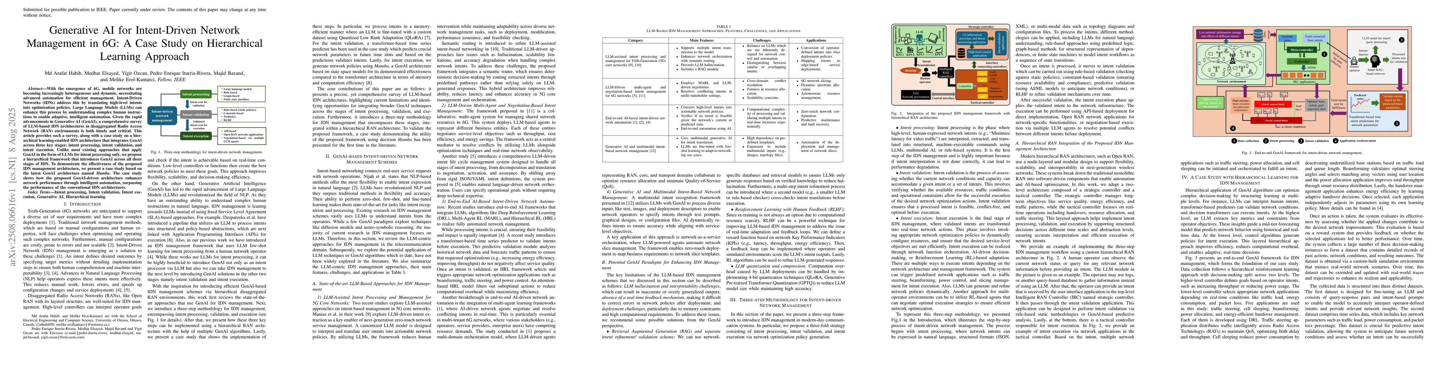 The paper presents a hierarchical learning approach for Intent-Driven Network (IDN) management in 6G, integrating Generative AI (GenAI) across intent processing, validation, and execution stages. It introduces a three-step framework consisting of intent processing, validation, and execution via network optimization policy generation, demonstrated through a case study using the Mamba GenAI architecture.