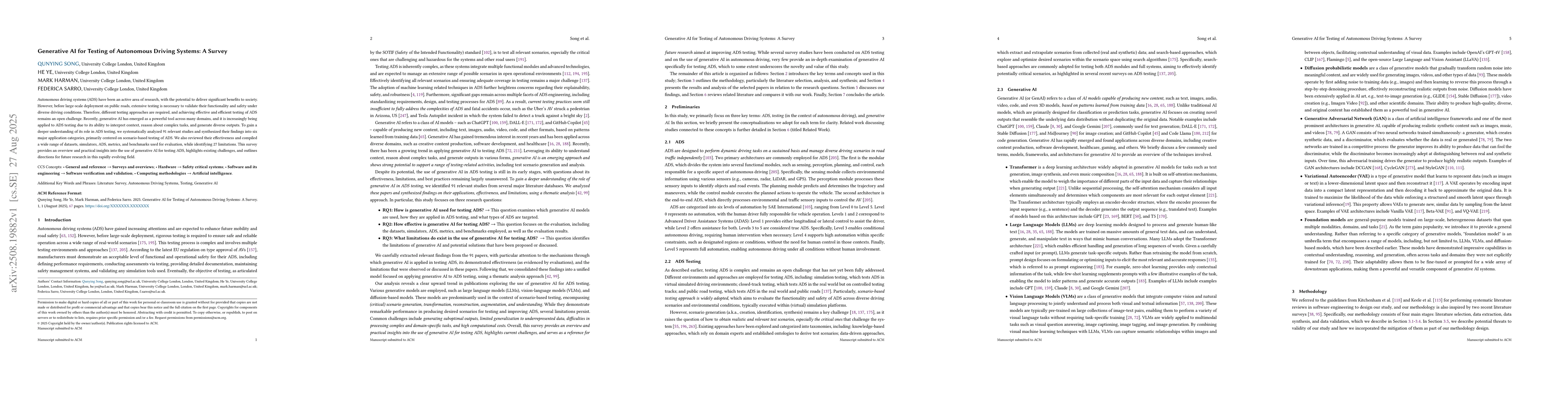 Autonomous driving systems (ADS) have been an active area of research, with the potential to deliver significant benefits to society. However, before large-scale deployment on public roads, extensive testing is necessary to validate their functionality and safety under diverse driving conditions. Therefore, different testing approaches are required, and achieving effective and efficient testing of ADS remains an open challenge. Recently, generative AI has emerged as a powerful tool across many domains, and it is increasingly being applied to ADS testing due to its ability to interpret context, reason about complex tasks, and generate diverse outputs. To gain a deeper understanding of its role in ADS testing, we systematically analyzed 91 relevant studies and synthesized their findings into six major application categories, primarily centered on scenario-based testing of ADS. We also reviewed their effectiveness and compiled a wide range of datasets, simulators, ADS, metrics, and benchmarks used for evaluation, while identifying 27 limitations. This survey provides an overview and practical insights into the use of generative AI for testing ADS, highlights existing challenges, and outlines directions for future research in this rapidly evolving field.