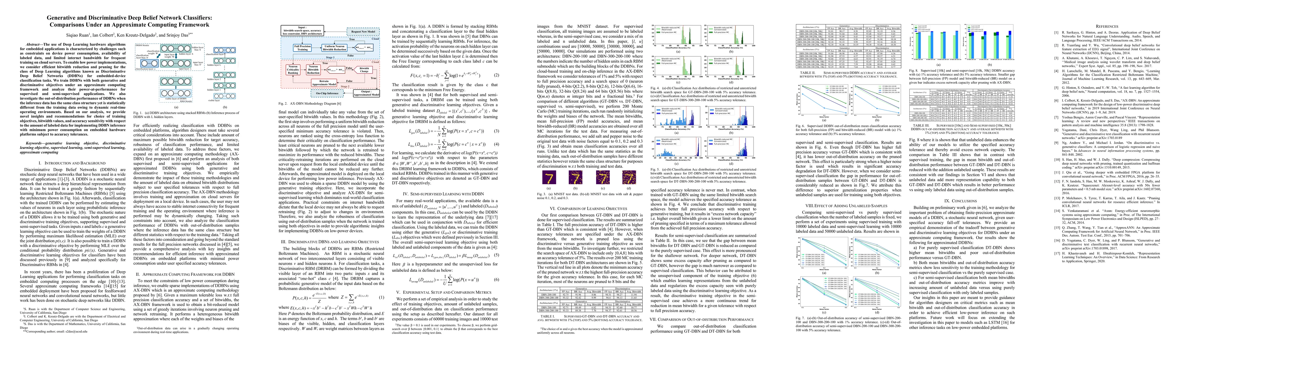 This paper compares generative and discriminative Deep Belief Network classifiers under an approximate computing framework to optimize power consumption for embedded applications. It evaluates the performance of Discriminative Deep Belief Networks with bitwidth reduction and pruning, providing insights into training objectives, bitwidth values, and the impact of limited labeled data on accuracy.