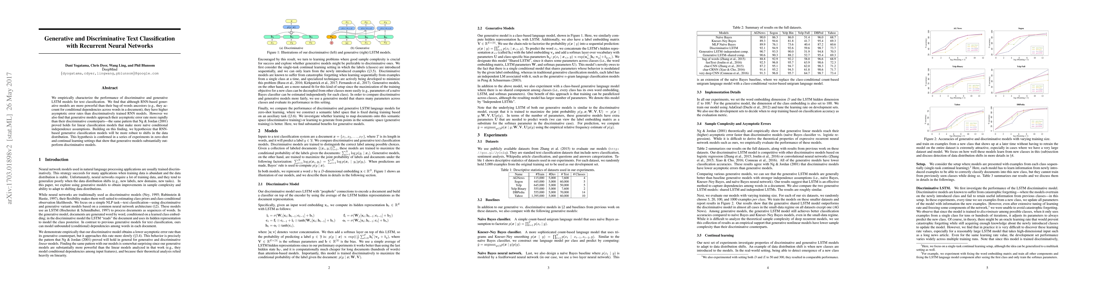 We empirically characterize the performance of discriminative and generative LSTM models for text classification. We find that although RNN-based generative models are more powerful than their bag-of-words ancestors (e.g., they account for conditional dependencies across words in a document), they have higher asymptotic error rates than discriminatively trained RNN models. However we also find that generative models approach their asymptotic error rate more rapidly than their discriminative counterparts---the same pattern that Ng & Jordan (2001) proved holds for linear classification models that make more naive conditional independence assumptions. Building on this finding, we hypothesize that RNN-based generative classification models will be more robust to shifts in the data distribution. This hypothesis is confirmed in a series of experiments in zero-shot and continual learning settings that show that generative models substantially outperform discriminative models.