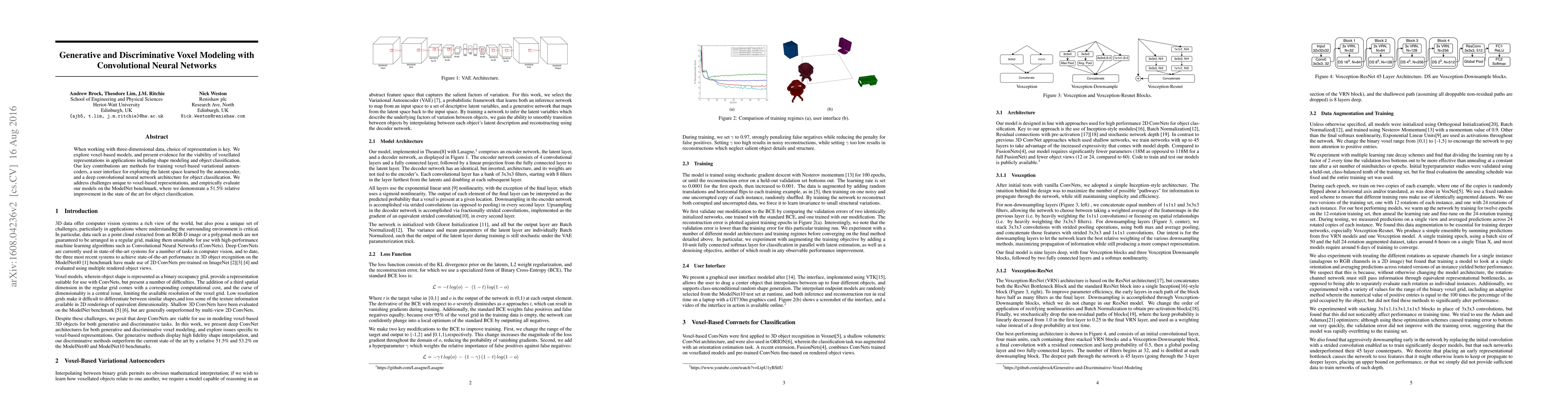 This paper introduces voxel-based variational autoencoders and a convolutional neural network architecture for 3D object classification, achieving a 51.5% relative improvement over the state of the art on the ModelNet benchmark. It also presents a user interface for exploring the latent space of the autoencoder.