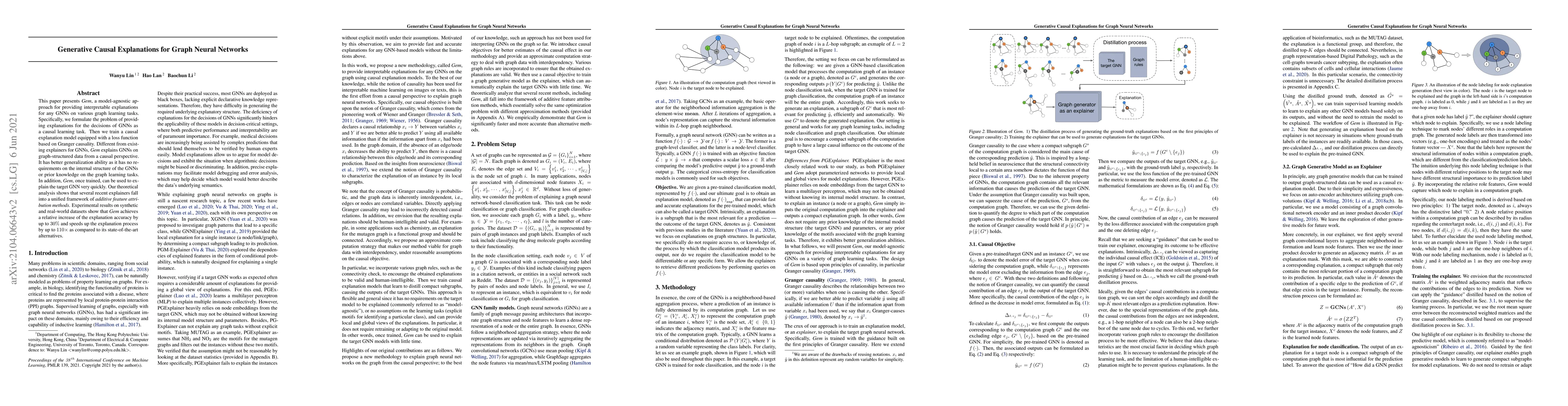 This paper presents Gem, a model-agnostic approach for providing interpretable explanations for any GNNs on various graph learning tasks. Specifically, we formulate the problem of providing explanations for the decisions of GNNs as a causal learning task. Then we train a causal explanation model equipped with a loss function based on Granger causality. Different from existing explainers for GNNs, Gem explains GNNs on graph-structured data from a causal perspective. It has better generalization ability as it has no requirements on the internal structure of the GNNs or prior knowledge on the graph learning tasks. In addition, Gem, once trained, can be used to explain the target GNN very quickly. Our theoretical analysis shows that several recent explainers fall into a unified framework of additive feature attribution methods. Experimental results on synthetic and real-world datasets show that Gem achieves a relative increase of the explanation accuracy by up to $30\%$ and speeds up the explanation process by up to $110\times$ as compared to its state-of-the-art alternatives.