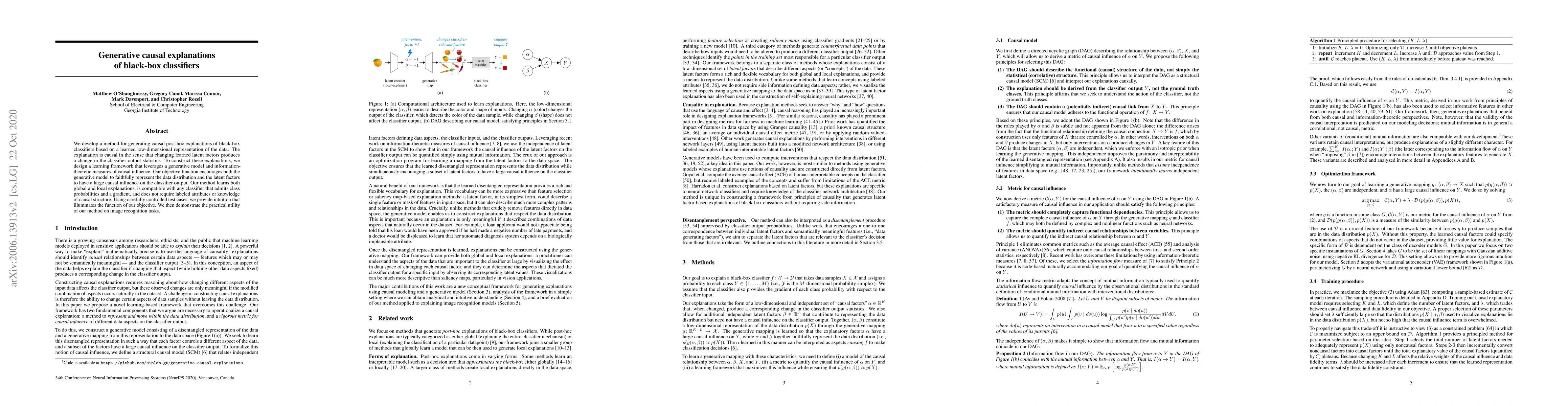 This paper introduces a method for generating causal explanations for black-box classifiers by leveraging a generative model and causal influence measures. The approach learns low-dimensional representations and provides both global and local explanations, demonstrating utility in image recognition tasks.