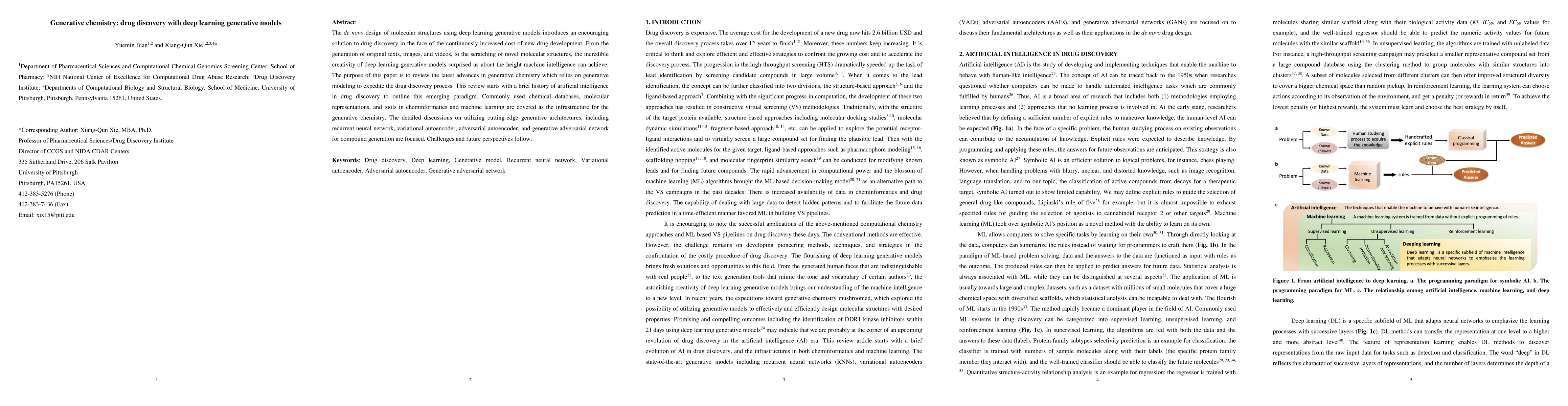 The paper provides a comprehensive review of deep learning generative models (RNN, VAE, AAE, GAN) and their applications in generative chemistry for drug discovery, detailing their architectures, training processes, and case studies.