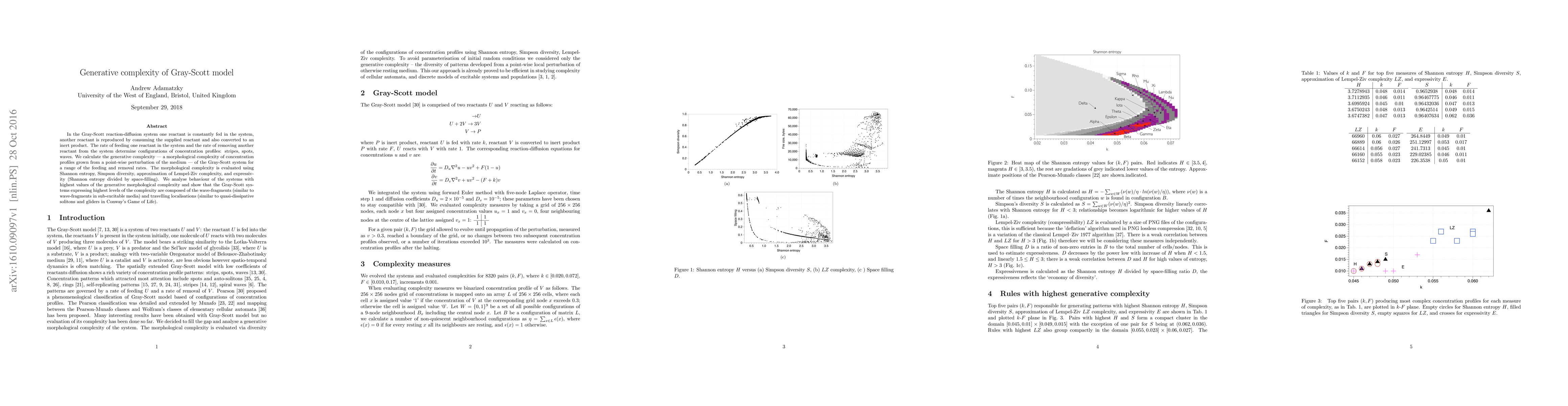 This paper investigates the generative complexity of the Gray-Scott reaction-diffusion system, evaluating the morphological complexity of concentration profiles using Shannon entropy, Simpson diversity, and other metrics. The study finds that the highest levels of complexity arise from patterns like wave-fragments and localised travelling structures.
