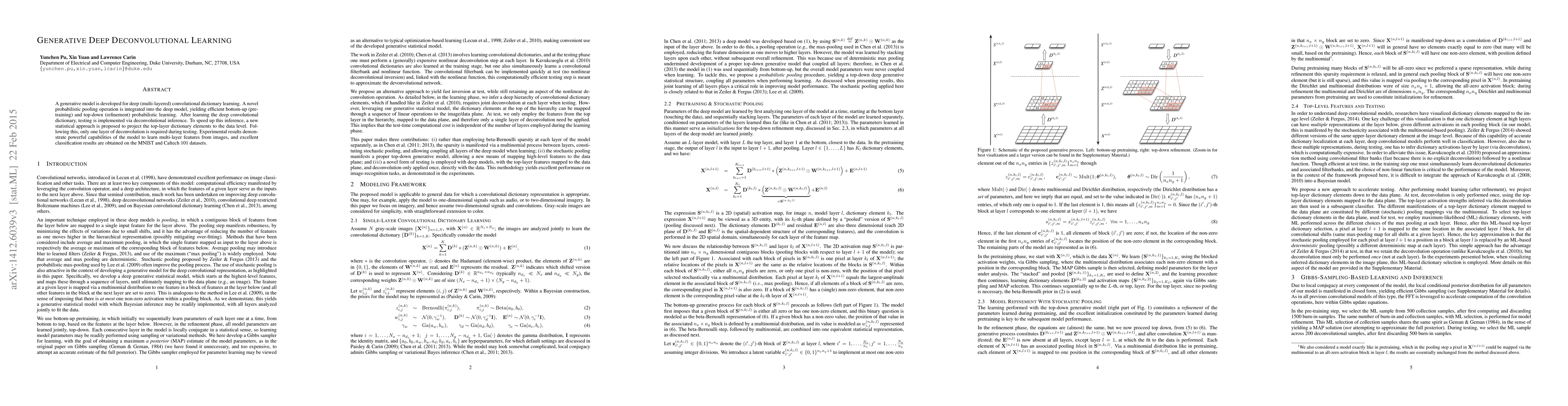 A generative Bayesian model is developed for deep (multi-layer) convolutional dictionary learning. A novel probabilistic pooling operation is integrated into the deep model, yielding efficient bottom-up and top-down probabilistic learning. After learning the deep convolutional dictionary, testing is implemented via deconvolutional inference. To speed up this inference, a new statistical approach is proposed to project the top-layer dictionary elements to the data level. Following this, only one layer of deconvolution is required during testing. Experimental results demonstrate powerful capabilities of the model to learn multi-layer features from images. Excellent classification results are obtained on both the MNIST and Caltech 101 datasets.