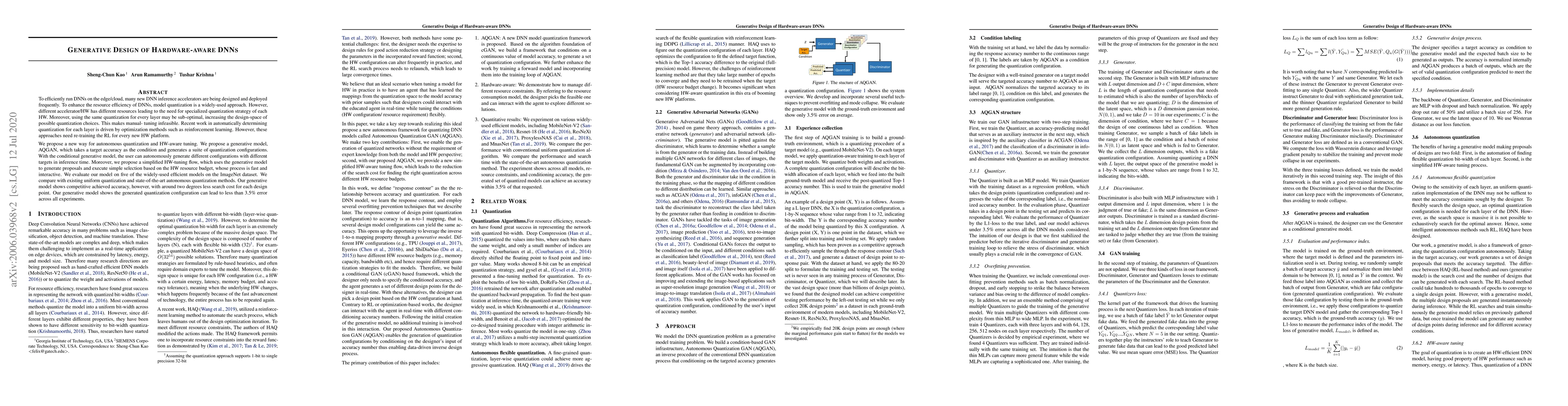 To efficiently run DNNs on the edge/cloud, many new DNN inference accelerators are being designed and deployed frequently. To enhance the resource efficiency of DNNs, model quantization is a widely-used approach. However, different accelerator/HW has different resources leading to the need for specialized quantization strategy of each HW. Moreover, using the same quantization for every layer may be sub-optimal, increasing the designspace of possible quantization choices. This makes manual-tuning infeasible. Recent work in automatically determining quantization for each layer is driven by optimization methods such as reinforcement learning. However, these approaches need re-training the RL for every new HW platform. We propose a new way for autonomous quantization and HW-aware tuning. We propose a generative model, AQGAN, which takes a target accuracy as the condition and generates a suite of quantization configurations. With the conditional generative model, the user can autonomously generate different configurations with different targets in inference time. Moreover, we propose a simplified HW-tuning flow, which uses the generative model to generate proposals and execute simple selection based on the HW resource budget, whose process is fast and interactive. We evaluate our model on five of the widely-used efficient models on the ImageNet dataset. We compare with existing uniform quantization and state-of-the-art autonomous quantization methods. Our generative model shows competitive achieved accuracy, however, with around two degrees less search cost for each design point. Our generative model shows the generated quantization configuration can lead to less than 3.5% error across all experiments.