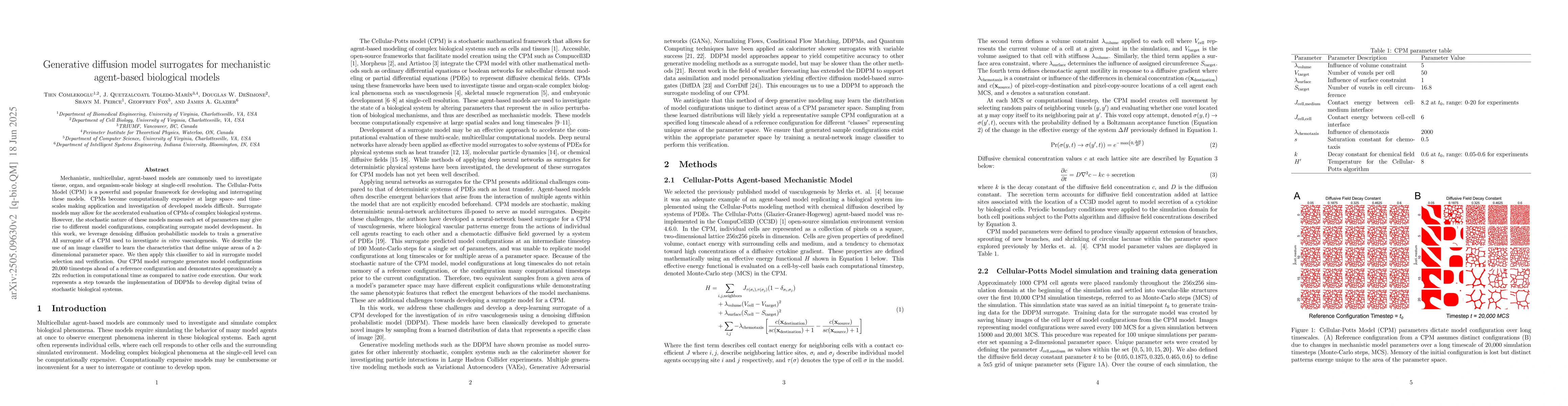 A generative diffusion model surrogate was developed to accelerate simulation of complex biological systems using the Cellular-Potts Model, reducing computational time by 22x.