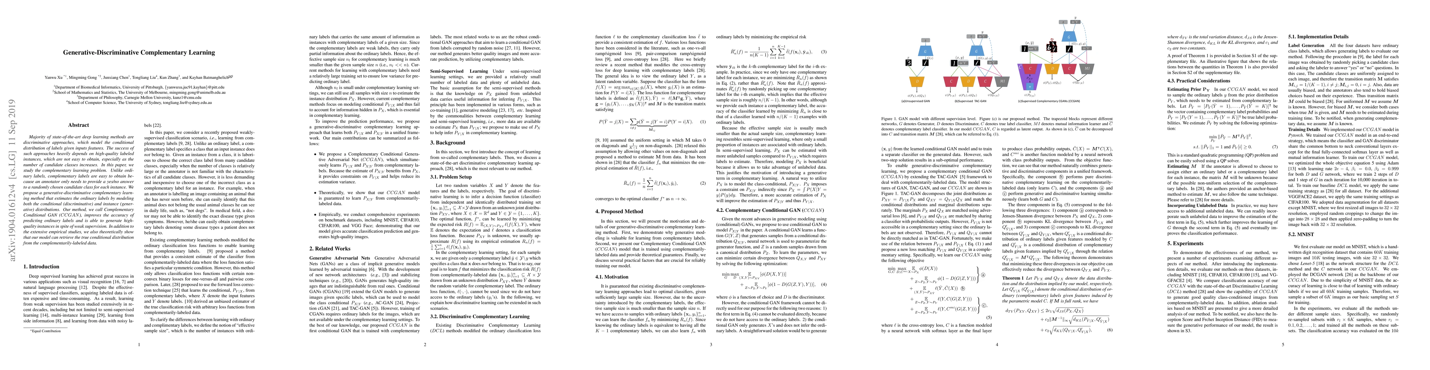Majority of state-of-the-art deep learning methods are discriminative approaches, which model the conditional distribution of labels given inputs features. The success of such approaches heavily depends on high-quality labeled instances, which are not easy to obtain, especially as the number of candidate classes increases. In this paper, we study the complementary learning problem. Unlike ordinary labels, complementary labels are easy to obtain because an annotator only needs to provide a yes/no answer to a randomly chosen candidate class for each instance. We propose a generative-discriminative complementary learning method that estimates the ordinary labels by modeling both the conditional (discriminative) and instance (generative) distributions. Our method, we call Complementary Conditional GAN (CCGAN), improves the accuracy of predicting ordinary labels and can generate high-quality instances in spite of weak supervision. In addition to the extensive empirical studies, we also theoretically show that our model can retrieve the true conditional distribution from the complementarily-labeled data.