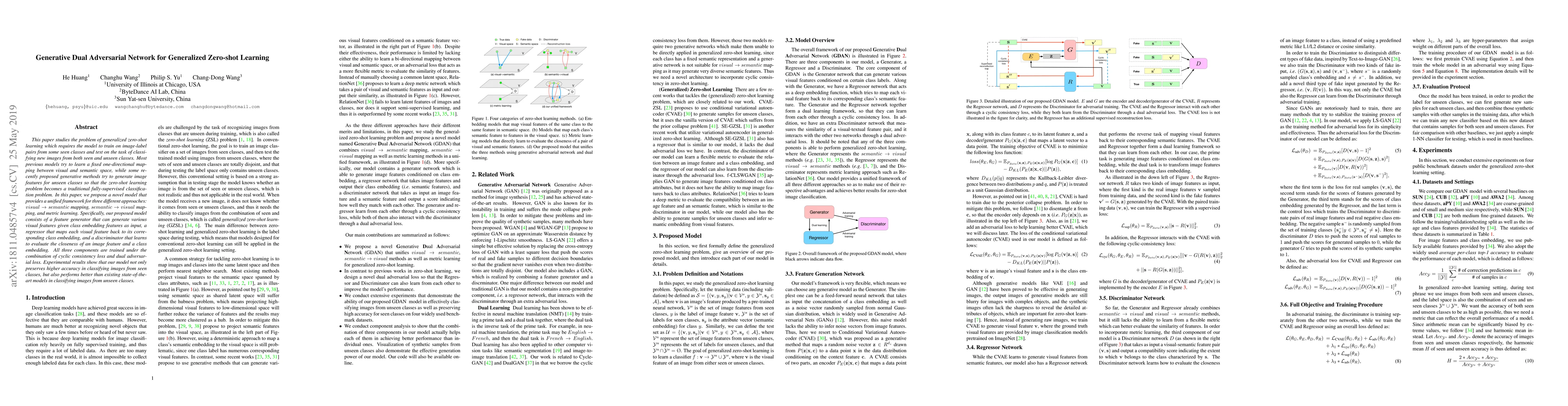 This paper introduces a Generative Dual Adversarial Network (GDAN) for generalized zero-shot learning, combining visual-to-semantic, semantic-to-visual mapping, and metric learning. The model uses a feature generator, regressor, and discriminator to enhance classification accuracy for both seen and unseen classes, outperforming existing methods.