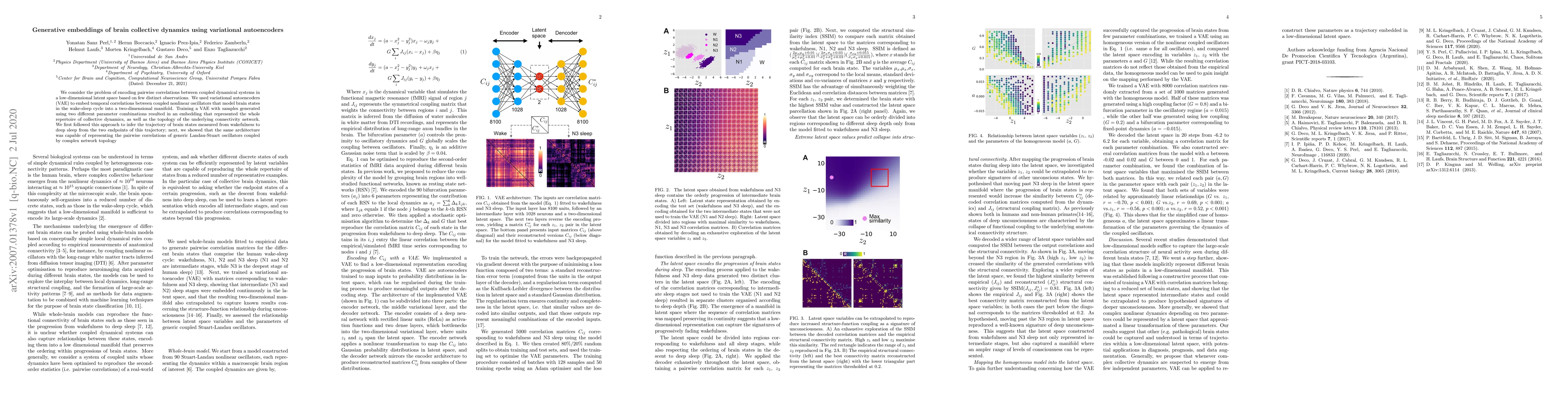 This paper employs variational autoencoders (VAE) to encode temporal correlations between coupled nonlinear oscillators modeling brain states into a low-dimensional latent space. The VAE successfully captures the collective dynamics and connectivity network topology, enabling the inference of brain state trajectories from wakefulness to deep sleep and the representation of generic coupled oscillators.
