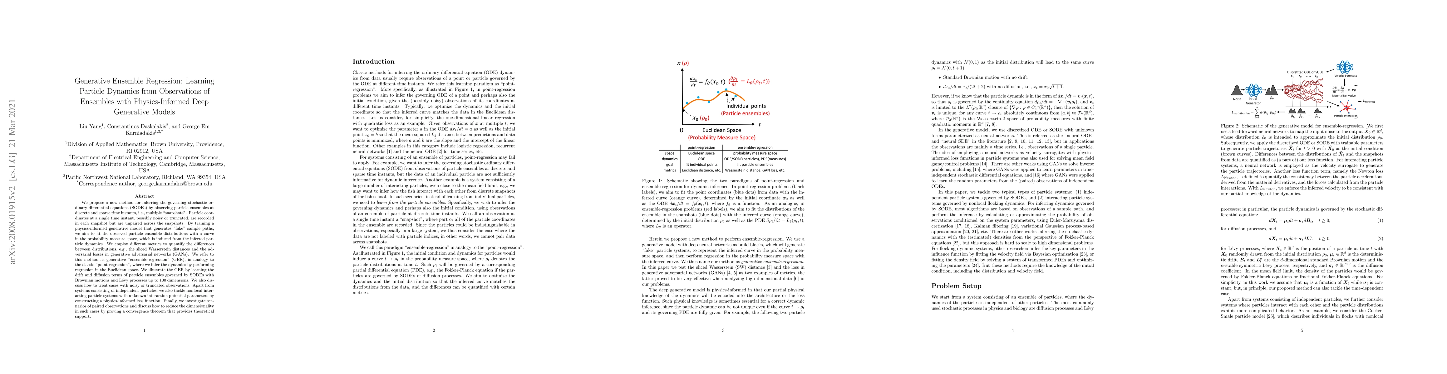 We propose a new method for inferring the governing stochastic ordinary differential equations (SODEs) by observing particle ensembles at discrete and sparse time instants, i.e., multiple "snapshots". Particle coordinates at a single time instant, possibly noisy or truncated, are recorded in each snapshot but are unpaired across the snapshots. By training a physics-informed generative model that generates "fake" sample paths, we aim to fit the observed particle ensemble distributions with a curve in the probability measure space, which is induced from the inferred particle dynamics. We employ different metrics to quantify the differences between distributions, e.g., the sliced Wasserstein distances and the adversarial losses in generative adversarial networks (GANs). We refer to this method as generative "ensemble-regression" (GER), in analogy to the classic "point-regression", where we infer the dynamics by performing regression in the Euclidean space. We illustrate the GER by learning the drift and diffusion terms of particle ensembles governed by SODEs with Brownian motions and Levy processes up to 100 dimensions. We also discuss how to treat cases with noisy or truncated observations. Apart from systems consisting of independent particles, we also tackle nonlocal interacting particle systems with unknown interaction potential parameters by constructing a physics-informed loss function. Finally, we investigate scenarios of paired observations and discuss how to reduce the dimensionality in such cases by proving a convergence theorem that provides theoretical support.