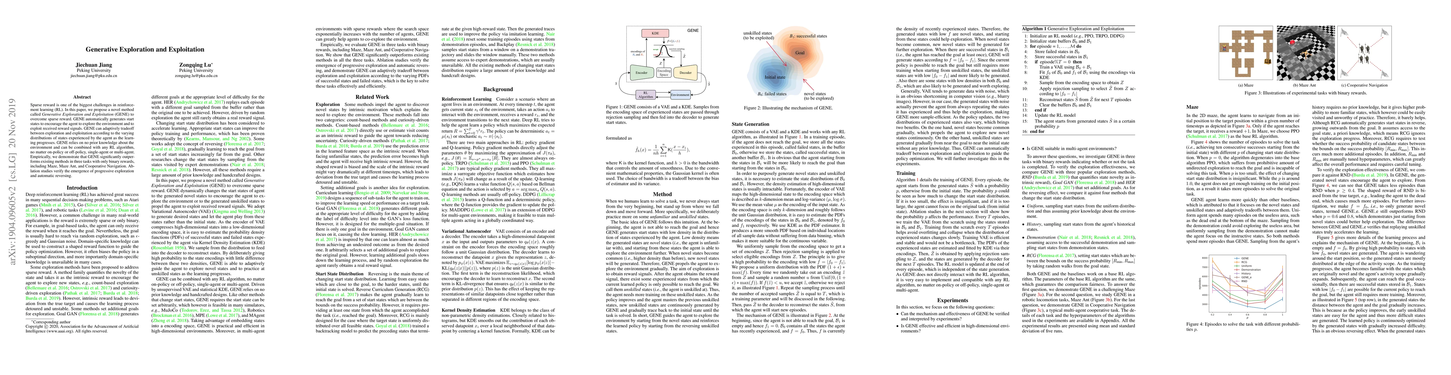 Generative Exploration and Exploitation (GENE) proposes a novel method to overcome sparse rewards in reinforcement learning by generating start states for exploration and exploitation. GENE outperforms existing methods in three tasks with binary rewards, showcasing its potential to adaptively balance exploration and exploitation.