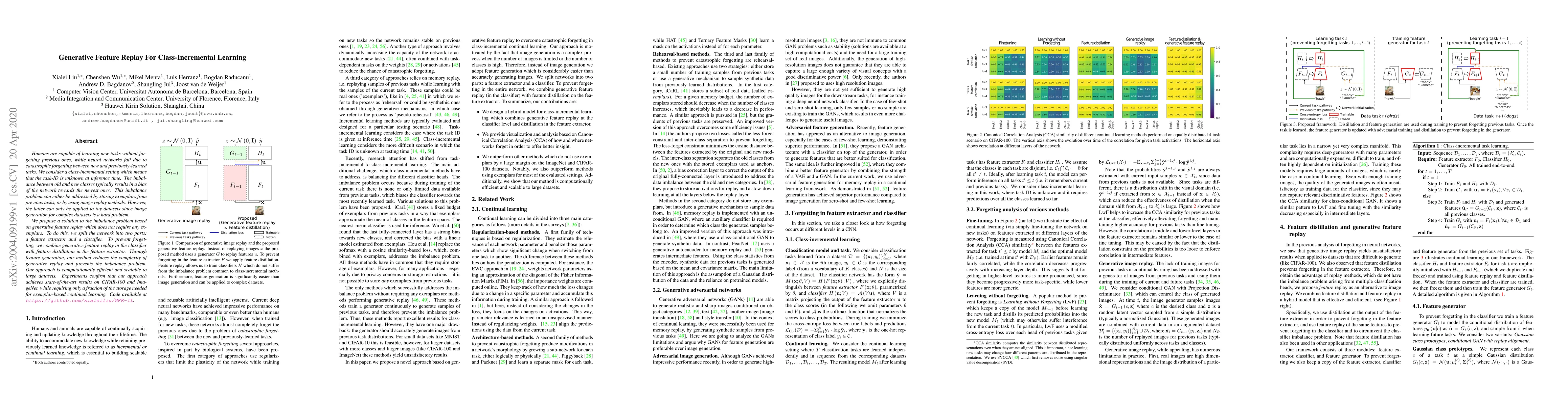 This paper introduces a generative feature replay method for class-incremental learning to mitigate catastrophic forgetting without needing to store exemplars. It combines generative feature replay with feature distillation, achieving state-of-the-art results on CIFAR-100 and ImageNet while requiring minimal storage.