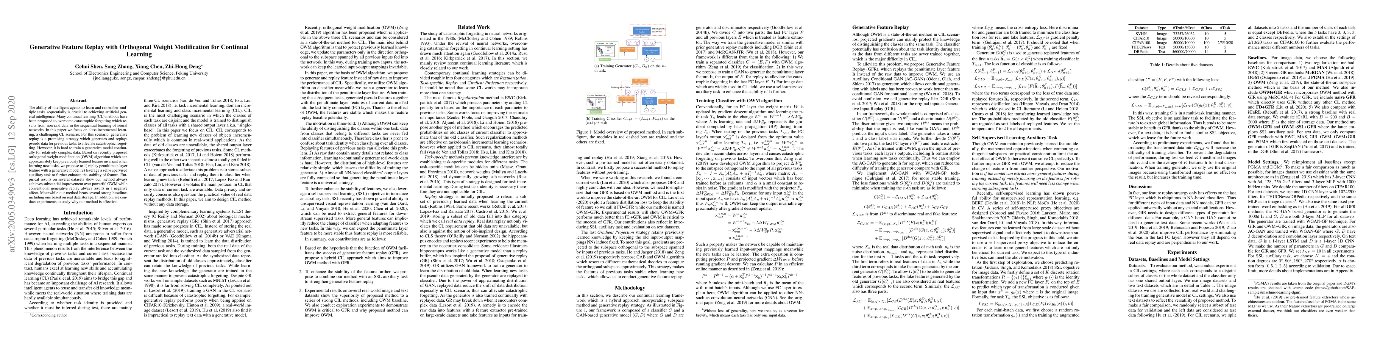 This paper proposes a generative feature replay method combined with orthogonal weight modification for class incremental continual learning, achieving substantial improvement over baselines by replaying penultimate layer features and leveraging a self-supervised auxiliary task to maintain feature stability. This method outperforms conventional generative replay and other strong baselines.