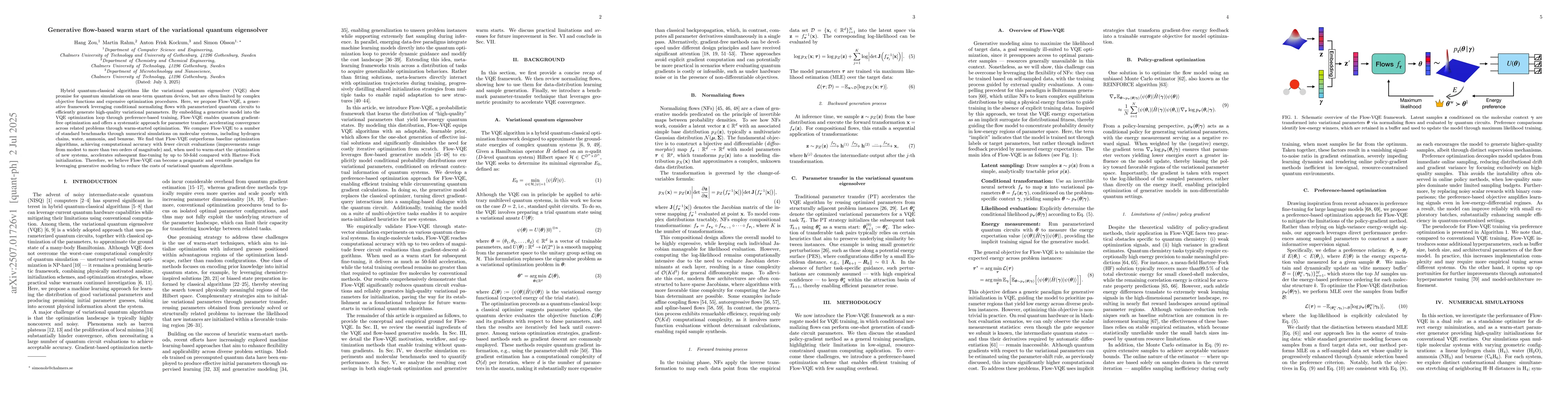 Hybrid quantum-classical algorithms like the variational quantum eigensolver (VQE) show promise for quantum simulations on near-term quantum devices, but are often limited by complex objective functions and expensive optimization procedures. Here, we propose Flow-VQE, a generative framework leveraging conditional normalizing flows with parameterized quantum circuits to efficiently generate high-quality variational parameters. By embedding a generative model into the VQE optimization loop through preference-based training, Flow-VQE enables quantum gradient-free optimization and offers a systematic approach for parameter transfer, accelerating convergence across related problems through warm-started optimization. We compare Flow-VQE to a number of standard benchmarks through numerical simulations on molecular systems, including hydrogen chains, water, ammonia, and benzene. We find that Flow-VQE outperforms baseline optimization algorithms, achieving computational accuracy with fewer circuit evaluations (improvements range from modest to more than two orders of magnitude) and, when used to warm-start the optimization of new systems, accelerates subsequent fine-tuning by up to 50-fold compared with Hartree--Fock initialization. Therefore, we believe Flow-VQE can become a pragmatic and versatile paradigm for leveraging generative modeling to reduce the costs of variational quantum algorithms.