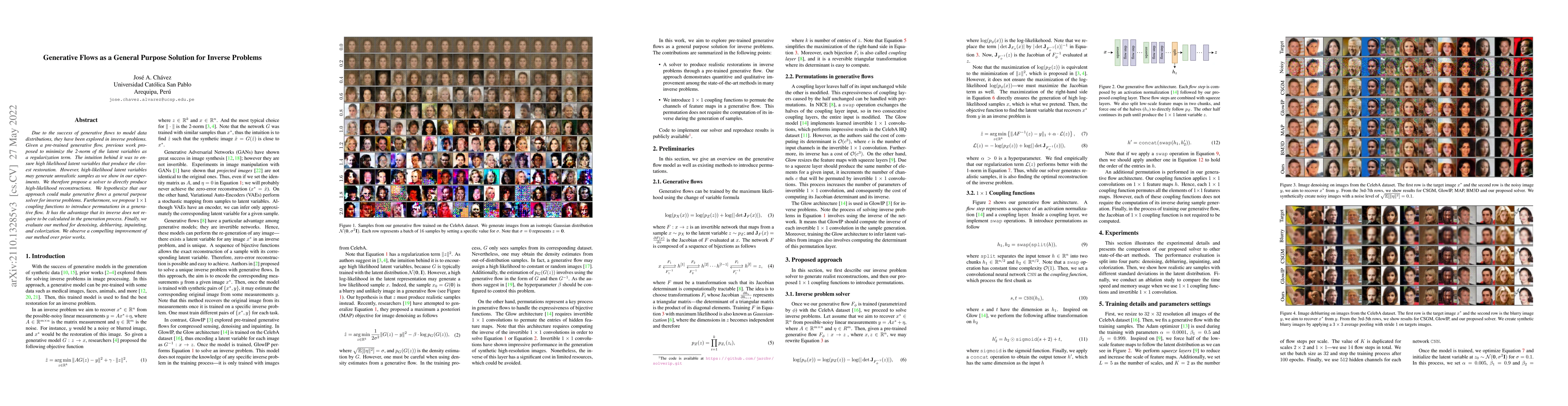 Due to the success of generative flows to model data distributions, they have been explored in inverse problems. Given a pre-trained generative flow, previous work proposed to minimize the 2-norm of the latent variables as a regularization term. The intuition behind it was to ensure high likelihood latent variables that produce the closest restoration. However, high-likelihood latent variables may generate unrealistic samples as we show in our experiments. We therefore propose a solver to directly produce high-likelihood reconstructions. We hypothesize that our approach could make generative flows a general purpose solver for inverse problems. Furthermore, we propose 1 x 1 coupling functions to introduce permutations in a generative flow. It has the advantage that its inverse does not require to be calculated in the generation process. Finally, we evaluate our method for denoising, deblurring, inpainting, and colorization. We observe a compelling improvement of our method over prior works.