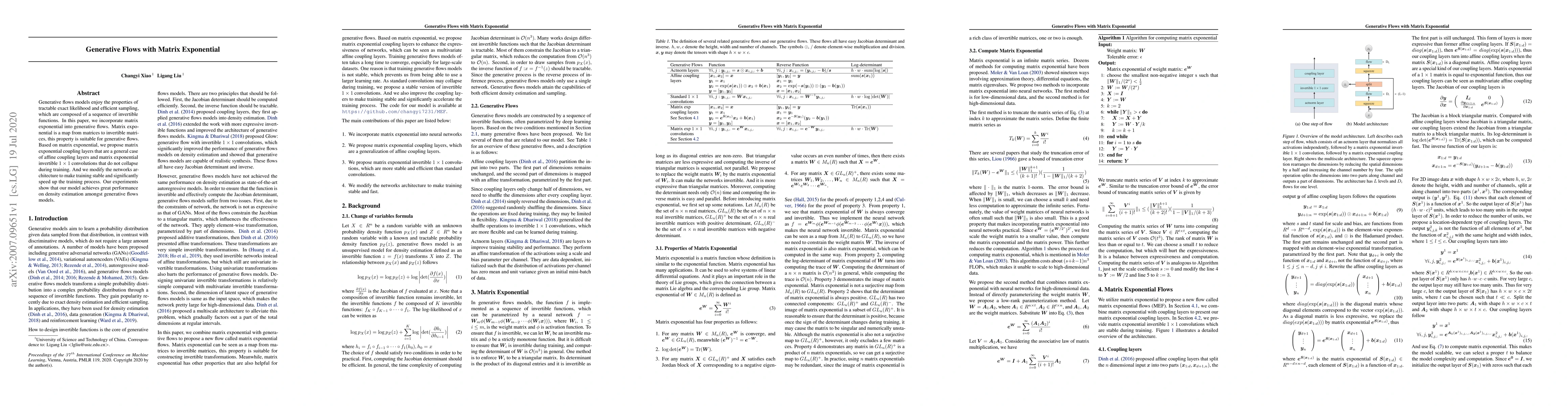 This paper introduces matrix exponential into generative flows to enhance tractable exact likelihood and efficient sampling. The proposed matrix exponential coupling layers and invertible 1 x 1 convolutions improve training stability and speed, leading to superior density estimation performance compared to other generative flow models.