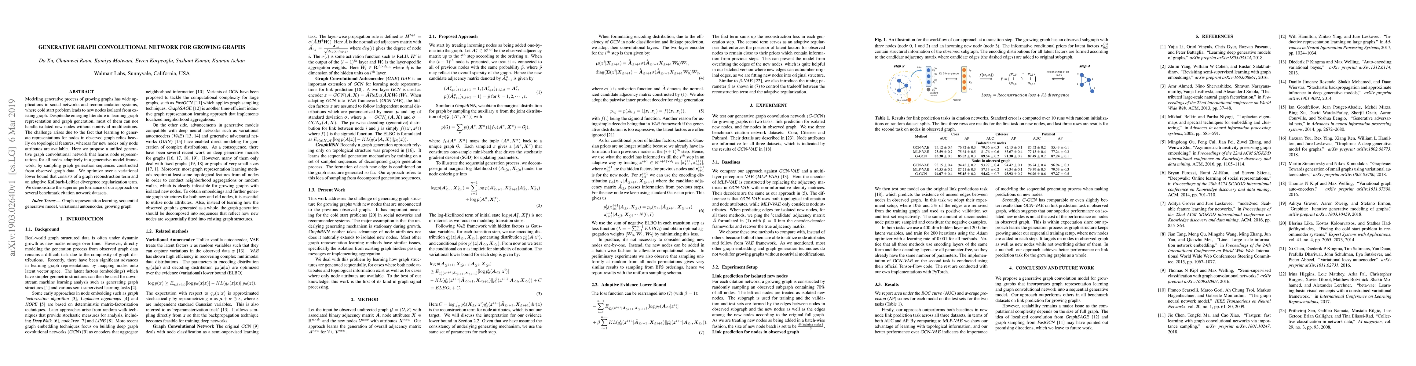Modeling generative process of growing graphs has wide applications in social networks and recommendation systems, where cold start problem leads to new nodes isolated from existing graph. Despite the emerging literature in learning graph representation and graph generation, most of them can not handle isolated new nodes without nontrivial modifications. The challenge arises due to the fact that learning to generate representations for nodes in observed graph relies heavily on topological features, whereas for new nodes only node attributes are available. Here we propose a unified generative graph convolutional network that learns node representations for all nodes adaptively in a generative model framework, by sampling graph generation sequences constructed from observed graph data. We optimize over a variational lower bound that consists of a graph reconstruction term and an adaptive Kullback-Leibler divergence regularization term. We demonstrate the superior performance of our approach on several benchmark citation network datasets.