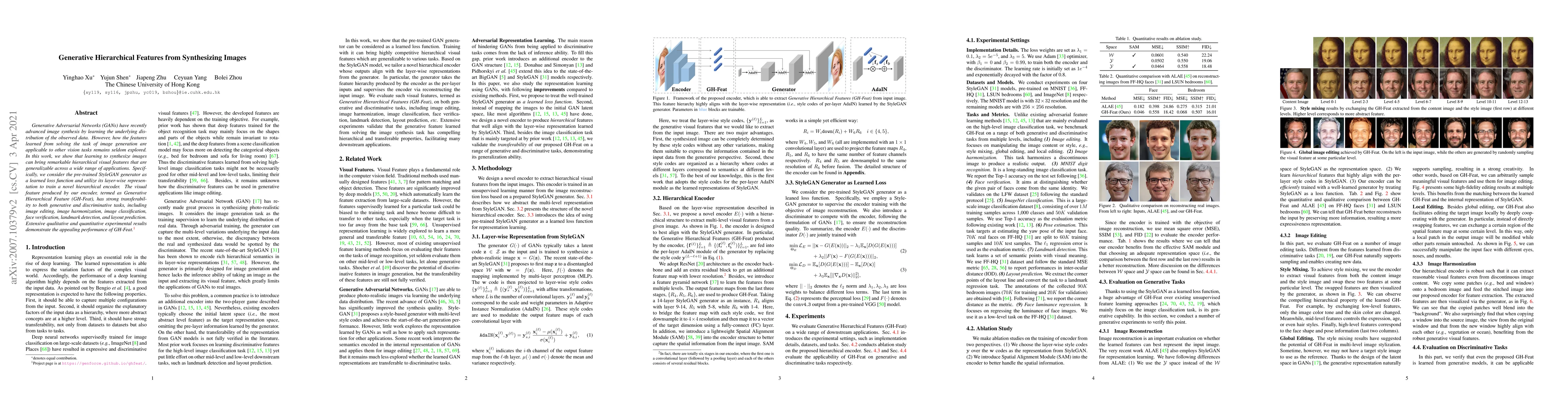 Generative Adversarial Networks (GANs) have recently advanced image synthesis by learning the underlying distribution of the observed data. However, how the features learned from solving the task of image generation are applicable to other vision tasks remains seldom explored. In this work, we show that learning to synthesize images can bring remarkable hierarchical visual features that are generalizable across a wide range of applications. Specifically, we consider the pre-trained StyleGAN generator as a learned loss function and utilize its layer-wise representation to train a novel hierarchical encoder. The visual feature produced by our encoder, termed as Generative Hierarchical Feature (GH-Feat), has strong transferability to both generative and discriminative tasks, including image editing, image harmonization, image classification, face verification, landmark detection, and layout prediction. Extensive qualitative and quantitative experimental results demonstrate the appealing performance of GH-Feat.