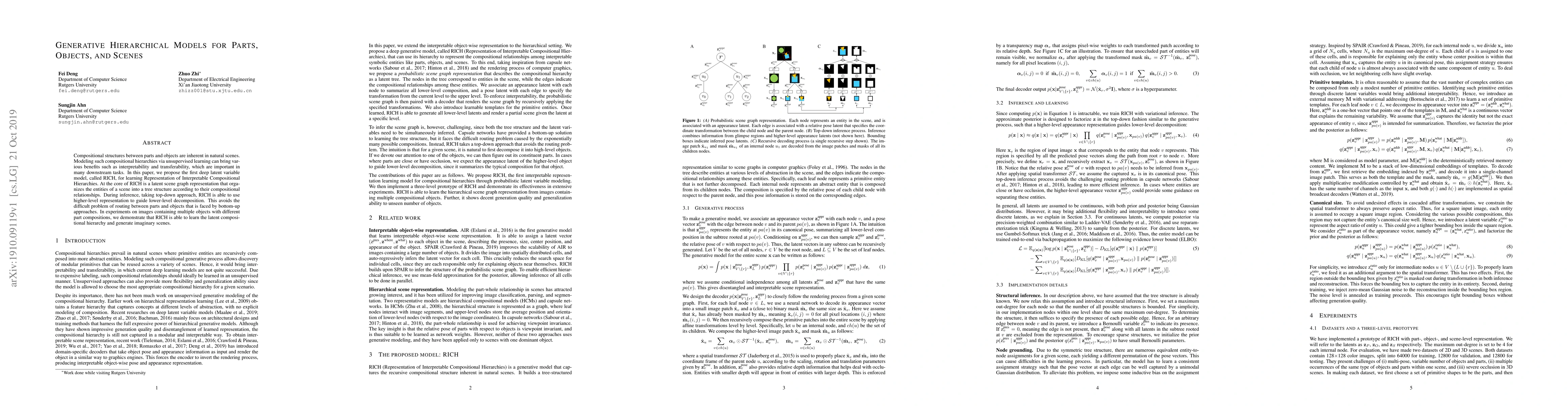 This paper introduces RICH, a deep latent variable model for learning interpretable compositional hierarchies in natural scenes. It employs a latent scene graph representation to organize entities into a tree structure, enabling top-down inference that avoids routing issues faced by bottom-up approaches.