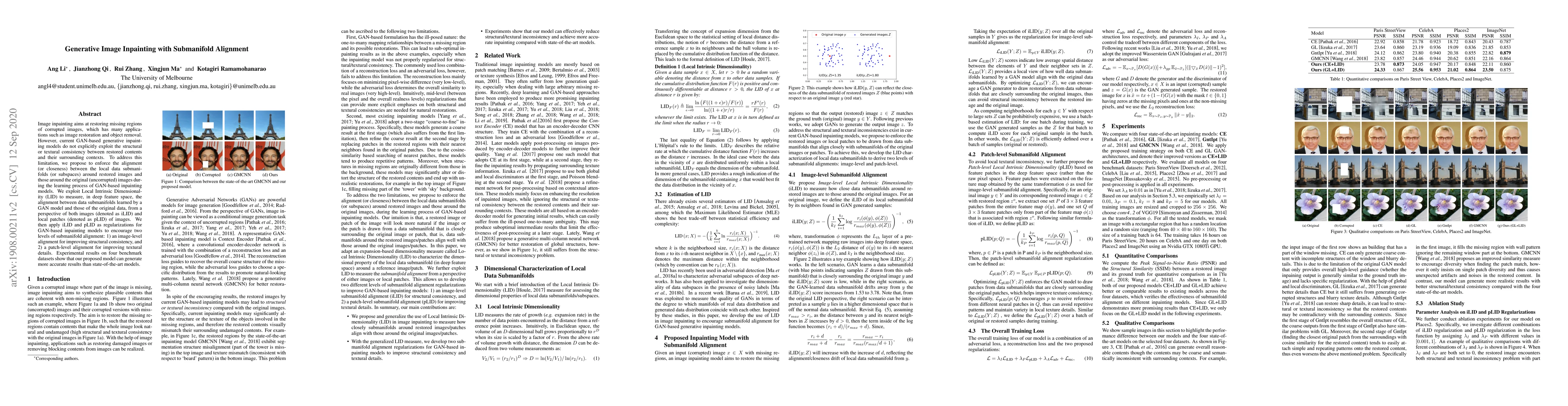 Image inpainting aims at restoring missing regions of corrupted images, which has many applications such as image restoration and object removal. However, current GAN-based generative inpainting models do not explicitly exploit the structural or textural consistency between restored contents and their surrounding contexts.To address this limitation, we propose to enforce the alignment (or closeness) between the local data submanifolds (or subspaces) around restored images and those around the original (uncorrupted) images during the learning process of GAN-based inpainting models. We exploit Local Intrinsic Dimensionality (LID) to measure, in deep feature space, the alignment between data submanifolds learned by a GAN model and those of the original data, from a perspective of both images (denoted as iLID) and local patches (denoted as pLID) of images. We then apply iLID and pLID as regularizations for GAN-based inpainting models to encourage two levels of submanifold alignment: 1) an image-level alignment for improving structural consistency, and 2) a patch-level alignment for improving textural details. Experimental results on four benchmark datasets show that our proposed model can generate more accurate results than state-of-the-art models.