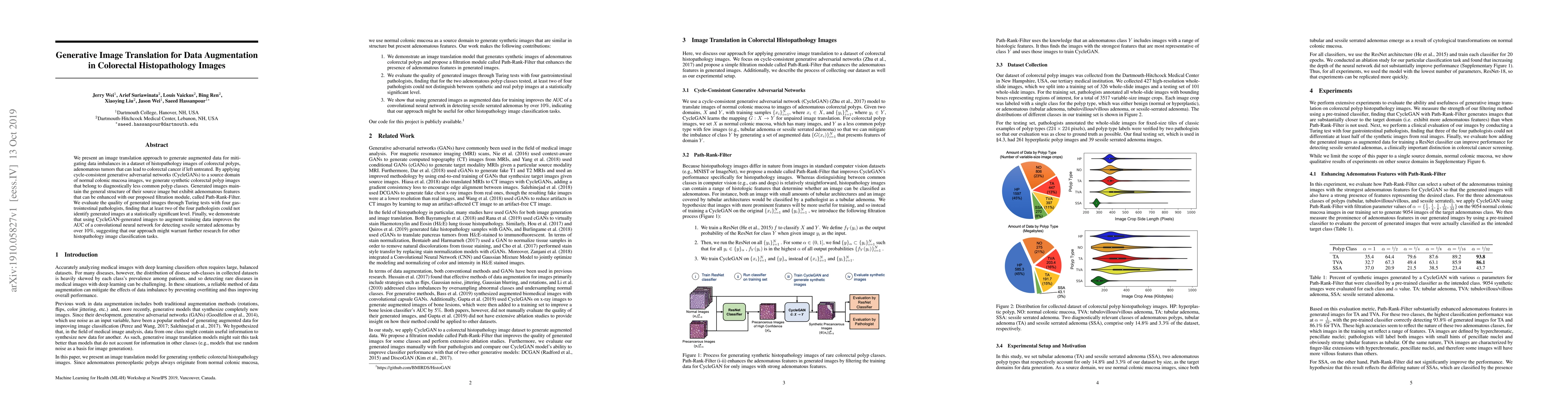 We present an image translation approach to generate augmented data for mitigating data imbalances in a dataset of histopathology images of colorectal polyps, adenomatous tumors that can lead to colorectal cancer if left untreated. By applying cycle-consistent generative adversarial networks (CycleGANs) to a source domain of normal colonic mucosa images, we generate synthetic colorectal polyp images that belong to diagnostically less common polyp classes. Generated images maintain the general structure of their source image but exhibit adenomatous features that can be enhanced with our proposed filtration module, called Path-Rank-Filter. We evaluate the quality of generated images through Turing tests with four gastrointestinal pathologists, finding that at least two of the four pathologists could not identify generated images at a statistically significant level. Finally, we demonstrate that using CycleGAN-generated images to augment training data improves the AUC of a convolutional neural network for detecting sessile serrated adenomas by over 10%, suggesting that our approach might warrant further research for other histopathology image classification tasks.