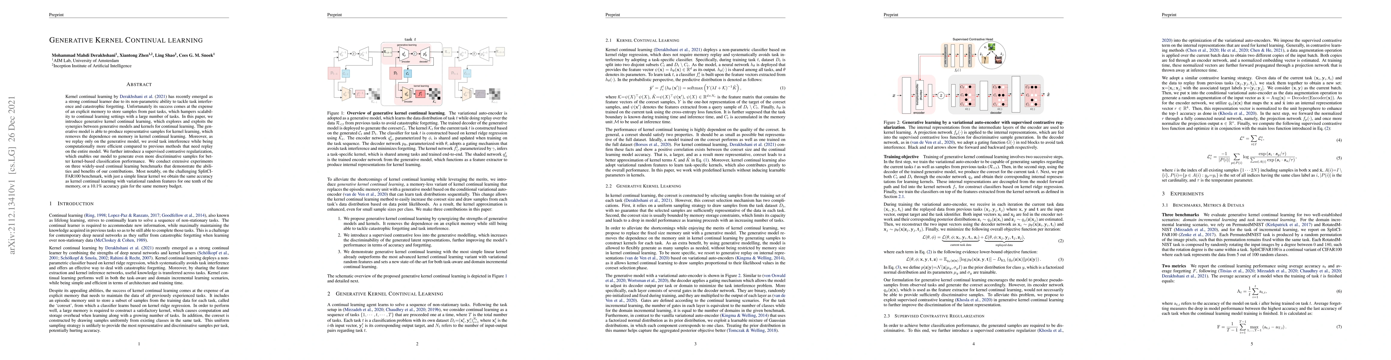 This paper introduces generative kernel continual learning, combining generative models with kernel methods to enhance scalability and efficiency in continual learning settings. The generative model produces representative samples, reducing memory dependence and computational costs while maintaining high classification performance.