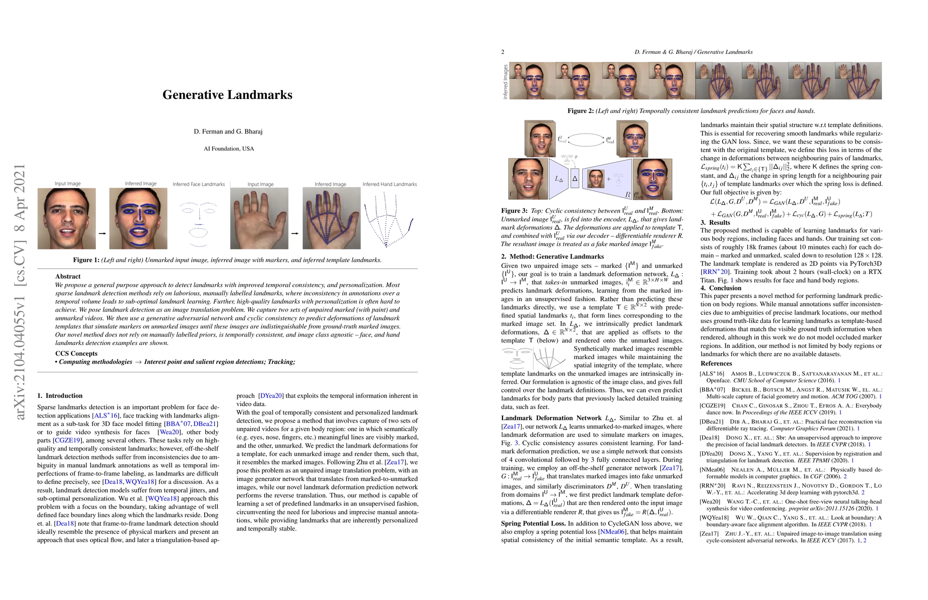 We propose a general purpose approach to detect landmarks with improved temporal consistency, and personalization. Most sparse landmark detection methods rely on laborious, manually labelled landmarks, where inconsistency in annotations over a temporal volume leads to sub-optimal landmark learning. Further, high-quality landmarks with personalization is often hard to achieve. We pose landmark detection as an image translation problem. We capture two sets of unpaired marked (with paint) and unmarked videos. We then use a generative adversarial network and cyclic consistency to predict deformations of landmark templates that simulate markers on unmarked images until these images are indistinguishable from ground-truth marked images. Our novel method does not rely on manually labelled priors, is temporally consistent, and image class agnostic -- face, and hand landmarks detection examples are shown.