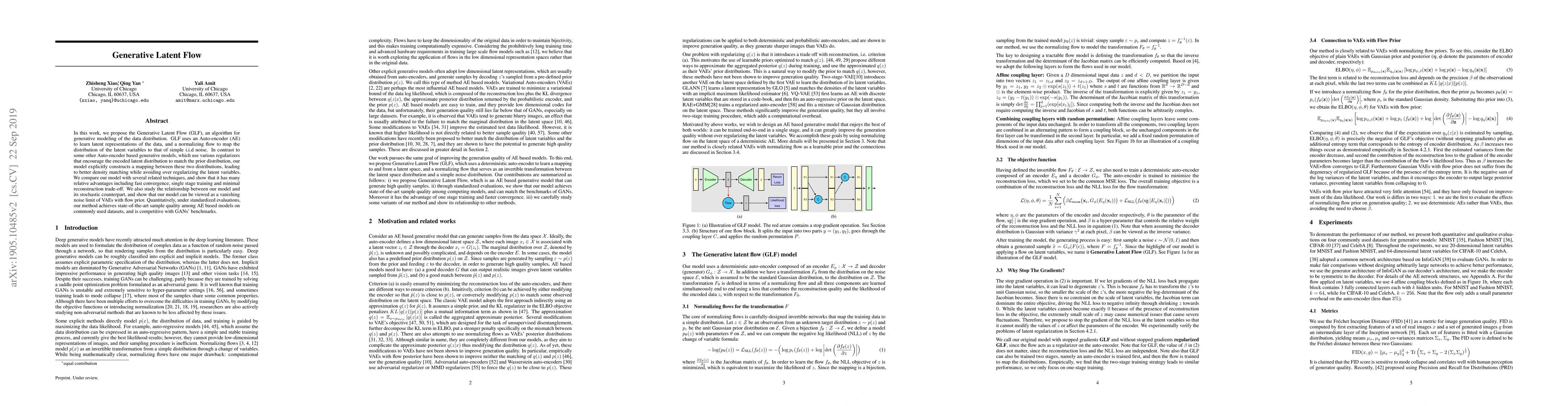 The Generative Latent Flow (GLF) algorithm leverages an Auto-encoder and normalizing flow for generative modeling, achieving better density matching and faster convergence compared to other Auto-encoder models. It outperforms related techniques in sample quality and is competitive with GAN benchmarks.