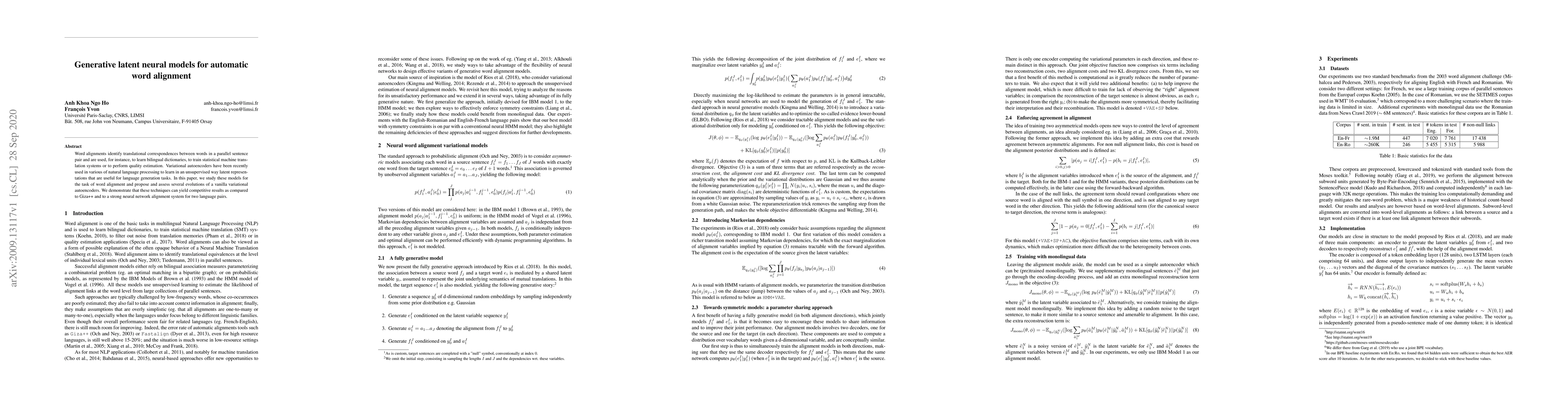 This paper explores the use of generative latent neural models, specifically variational autoencoders, for automatic word alignment in parallel sentences. The proposed models show competitive performance compared to existing methods like Giza++ and a strong neural network alignment system for two language pairs.