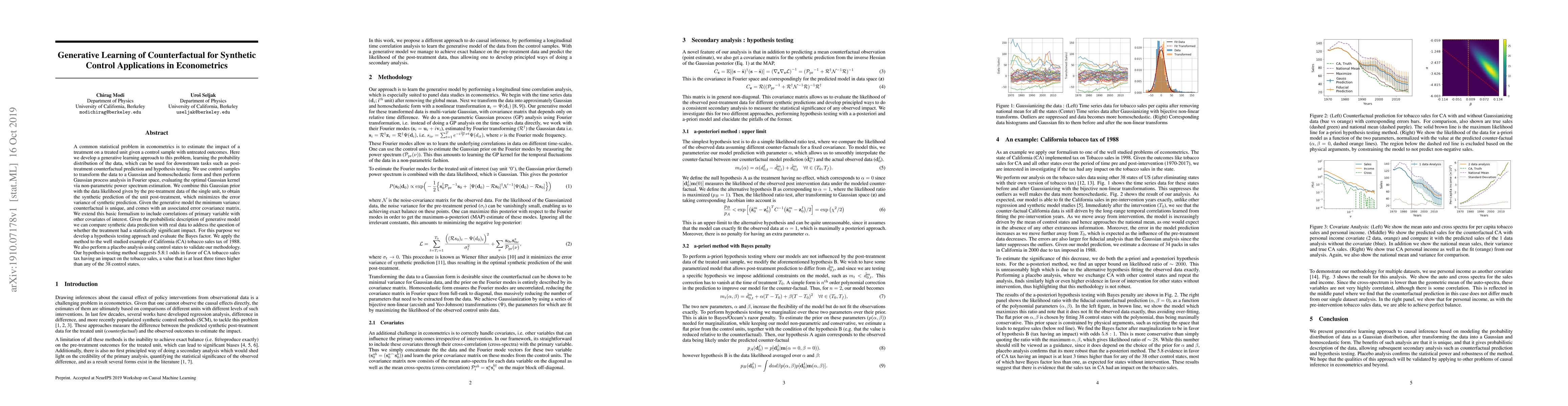 A common statistical problem in econometrics is to estimate the impact of a treatment on a treated unit given a control sample with untreated outcomes. Here we develop a generative learning approach to this problem, learning the probability distribution of the data, which can be used for downstream tasks such as post-treatment counterfactual prediction and hypothesis testing. We use control samples to transform the data to a Gaussian and homoschedastic form and then perform Gaussian process analysis in Fourier space, evaluating the optimal Gaussian kernel via non-parametric power spectrum estimation. We combine this Gaussian prior with the data likelihood given by the pre-treatment data of the single unit, to obtain the synthetic prediction of the unit post-treatment, which minimizes the error variance of synthetic prediction. Given the generative model the minimum variance counterfactual is unique, and comes with an associated error covariance matrix. We extend this basic formalism to include correlations of primary variable with other covariates of interest. Given the probabilistic description of generative model we can compare synthetic data prediction with real data to address the question of whether the treatment had a statistically significant impact. For this purpose we develop a hypothesis testing approach and evaluate the Bayes factor. We apply the method to the well studied example of California (CA) tobacco sales tax of 1988. We also perform a placebo analysis using control states to validate our methodology. Our hypothesis testing method suggests 5.8:1 odds in favor of CA tobacco sales tax having an impact on the tobacco sales, a value that is at least three times higher than any of the 38 control states.