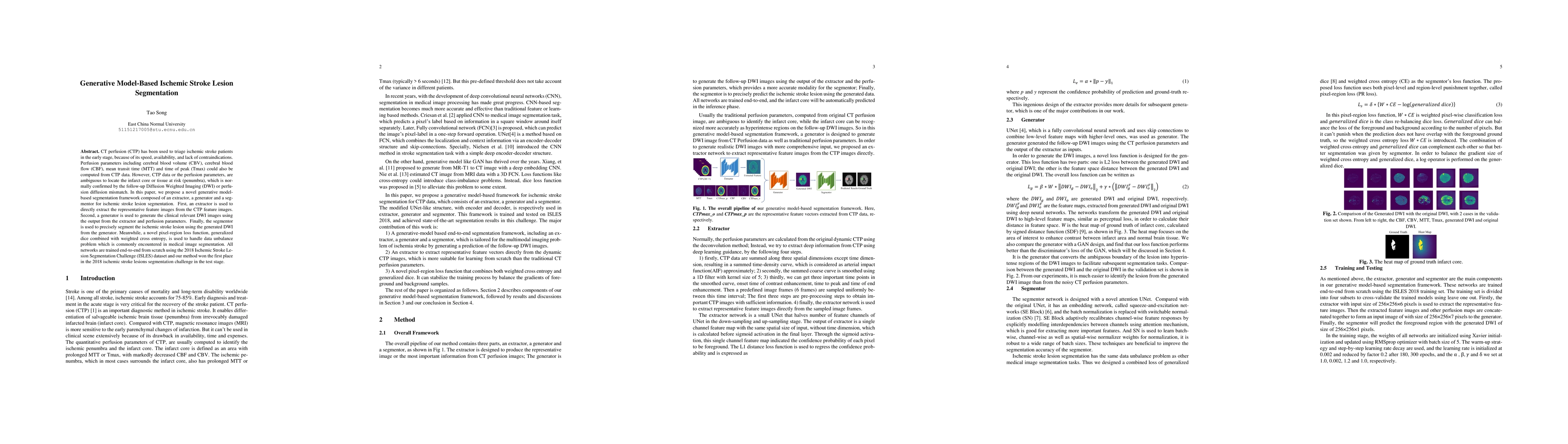 A novel generative model-based end-to-end segmentation framework is proposed for ischemic stroke lesion segmentation using CT perfusion images.