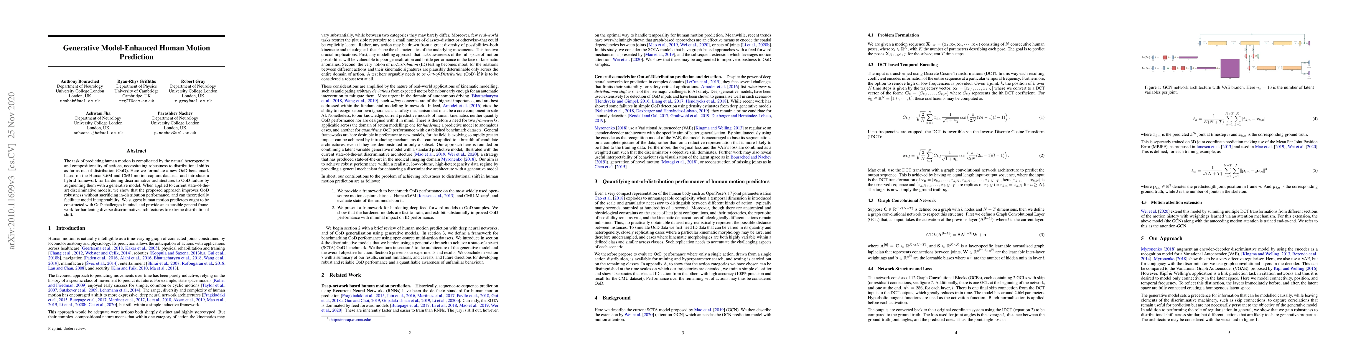 The task of predicting human motion is complicated by the natural heterogeneity and compositionality of actions, necessitating robustness to distributional shifts as far as out-of-distribution (OoD). Here we formulate a new OoD benchmark based on the Human3.6M and CMU motion capture datasets, and introduce a hybrid framework for hardening discriminative architectures to OoD failure by augmenting them with a generative model. When applied to current state-of-the-art discriminative models, we show that the proposed approach improves OoD robustness without sacrificing in-distribution performance, and can theoretically facilitate model interpretability. We suggest human motion predictors ought to be constructed with OoD challenges in mind, and provide an extensible general framework for hardening diverse discriminative architectures to extreme distributional shift. The code is available at https://github.com/bouracha/OoDMotion.