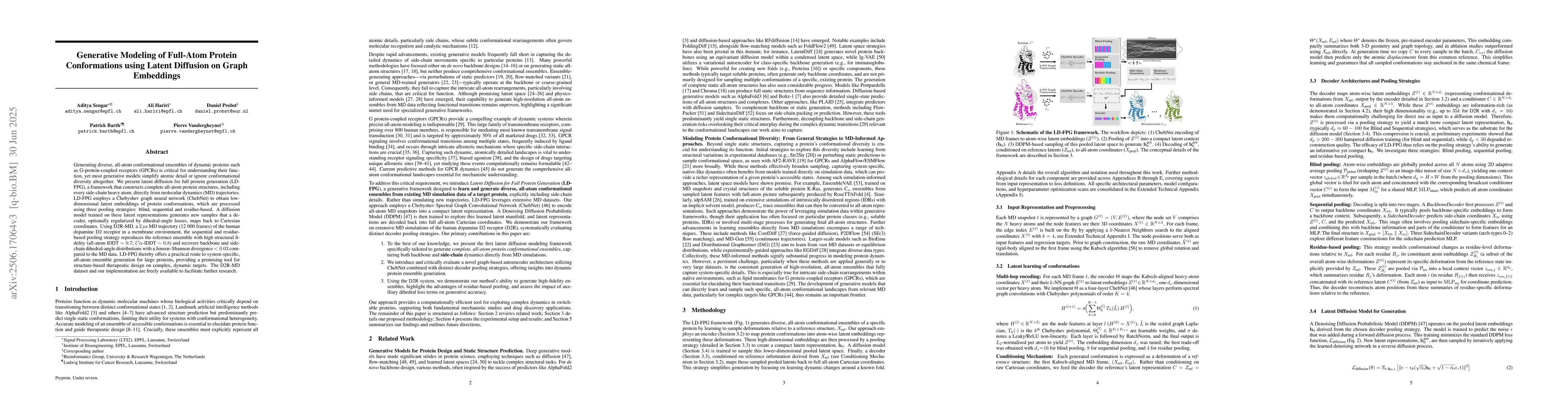 Generating diverse, all-atom conformational ensembles of dynamic proteins such as G-protein-coupled receptors (GPCRs) is critical for understanding their function, yet most generative models simplify atomic detail or ignore conformational diversity altogether. We present latent diffusion for full protein generation (LD-FPG), a framework that constructs complete all-atom protein structures, including every side-chain heavy atom, directly from molecular dynamics (MD) trajectories. LD-FPG employs a Chebyshev graph neural network (ChebNet) to obtain low-dimensional latent embeddings of protein conformations, which are processed using three pooling strategies: blind, sequential and residue-based. A diffusion model trained on these latent representations generates new samples that a decoder, optionally regularized by dihedral-angle losses, maps back to Cartesian coordinates. Using D2R-MD, a 2-microsecond MD trajectory (12 000 frames) of the human dopamine D2 receptor in a membrane environment, the sequential and residue-based pooling strategy reproduces the reference ensemble with high structural fidelity (all-atom lDDT of approximately 0.7; C-alpha-lDDT of approximately 0.8) and recovers backbone and side-chain dihedral-angle distributions with a Jensen-Shannon divergence of less than 0.03 compared to the MD data. LD-FPG thereby offers a practical route to system-specific, all-atom ensemble generation for large proteins, providing a promising tool for structure-based therapeutic design on complex, dynamic targets. The D2R-MD dataset and our implementation are freely available to facilitate further research.