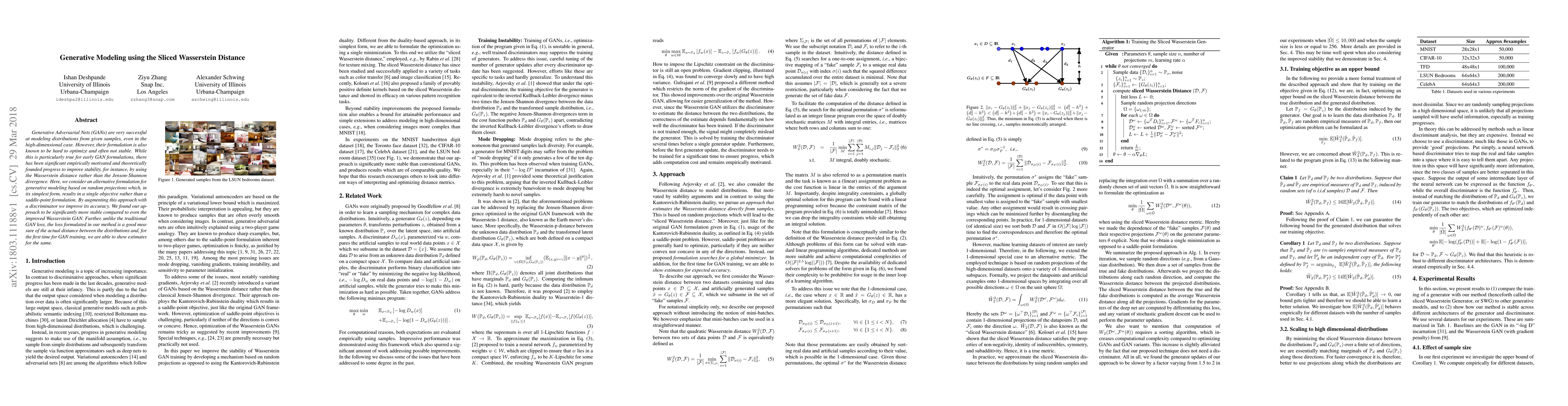 This paper proposes a generative modeling approach using the sliced Wasserstein distance, which offers a more stable alternative to traditional GANs. The method employs random projections to create a single objective, enhancing stability and accuracy when combined with a discriminator, and provides a reliable measure of distribution distance.