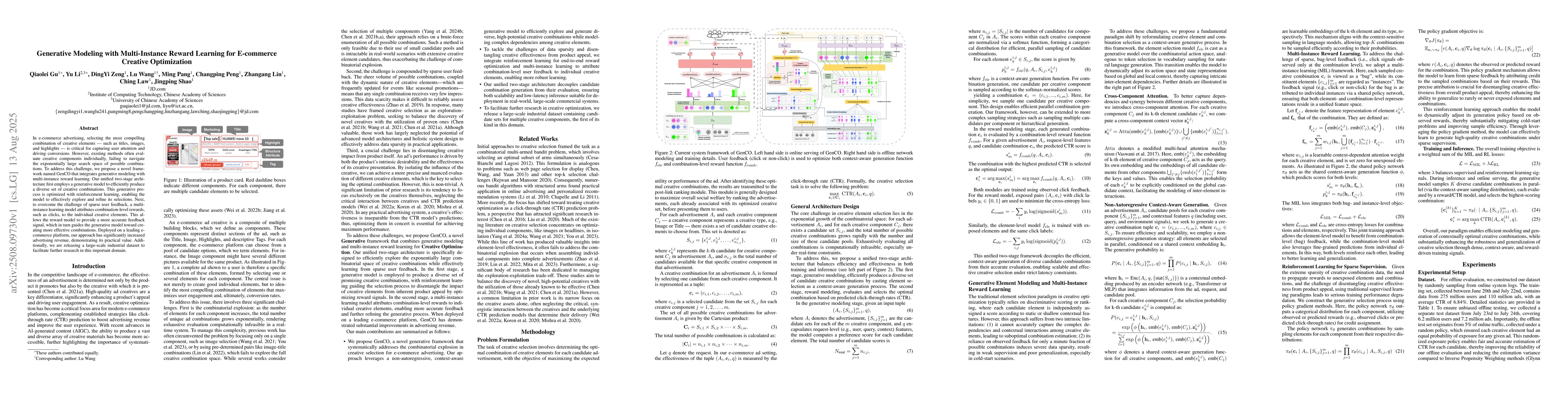 In e-commerce advertising, selecting the most compelling combination of creative elements -- such as titles, images, and highlights -- is critical for capturing user attention and driving conversions. However, existing methods often evaluate creative components individually, failing to navigate the exponentially large search space of possible combinations. To address this challenge, we propose a novel framework named GenCO that integrates generative modeling with multi-instance reward learning. Our unified two-stage architecture first employs a generative model to efficiently produce a diverse set of creative combinations. This generative process is optimized with reinforcement learning, enabling the model to effectively explore and refine its selections. Next, to overcome the challenge of sparse user feedback, a multi-instance learning model attributes combination-level rewards, such as clicks, to the individual creative elements. This allows the reward model to provide a more accurate feedback signal, which in turn guides the generative model toward creating more effective combinations. Deployed on a leading e-commerce platform, our approach has significantly increased advertising revenue, demonstrating its practical value. Additionally, we are releasing a large-scale industrial dataset to facilitate further research in this important domain.