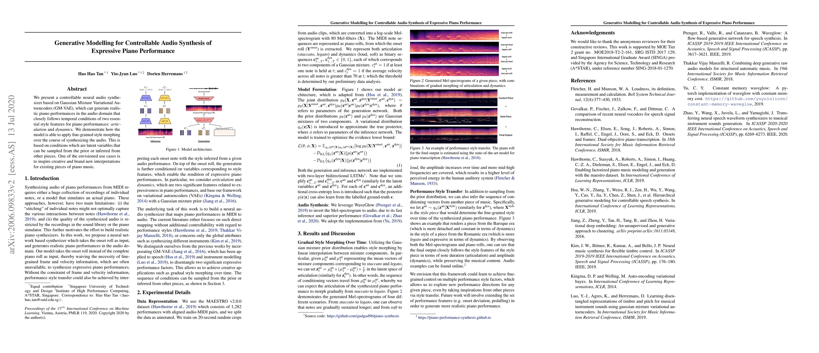 This paper introduces a neural audio synthesizer using GM-VAE to generate realistic piano performances with controllable articulation and dynamics. The model enables fine-grained style morphing, potentially inspiring creative reinterpretations of existing piano music.