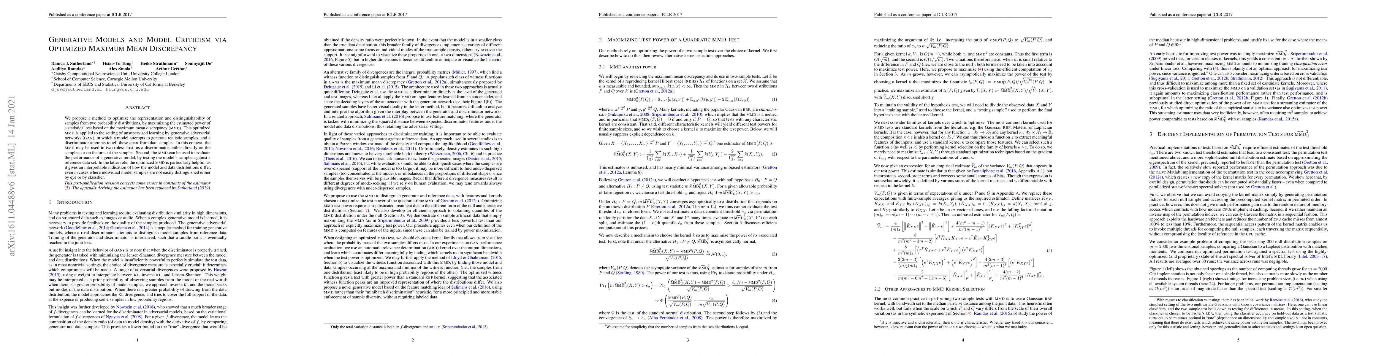 This paper proposes a method to optimize the maximum mean discrepancy (MMD) for distinguishing samples from two distributions, enhancing generative adversarial networks (GANs) by using MMD as both a discriminator and a performance evaluator for generative models. The optimized MMD provides an interpretable measure of model-generated sample quality against reference data.