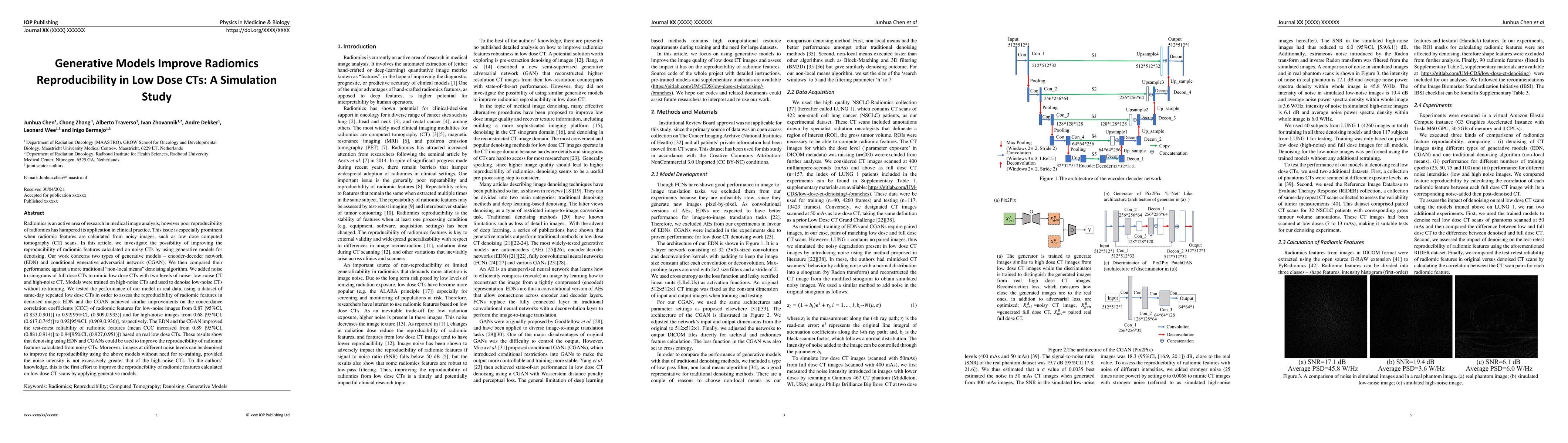 This study demonstrates that generative models, specifically encoder-decoder networks (EDN) and conditional generative adversarial networks (CGANs), can significantly improve the reproducibility of radiomic features in low dose CT scans by effectively denoising the images. The models enhanced concordance correlation coefficients and test-retest reliability, showing promising results for clinical applicability.