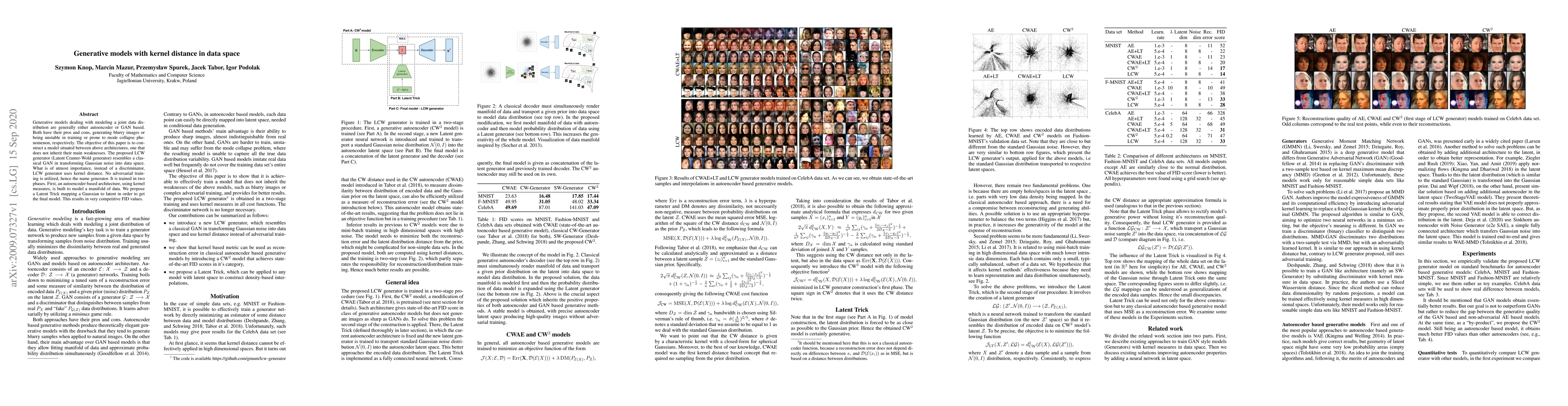 This paper proposes a novel LCW generator that combines elements of autoencoders and GANs, aiming to avoid their respective weaknesses. Instead of adversarial training, it uses kernel distance, achieving competitive FID values through a two-phase training process involving an autoencoder-based architecture and a Latent Trick mapping.