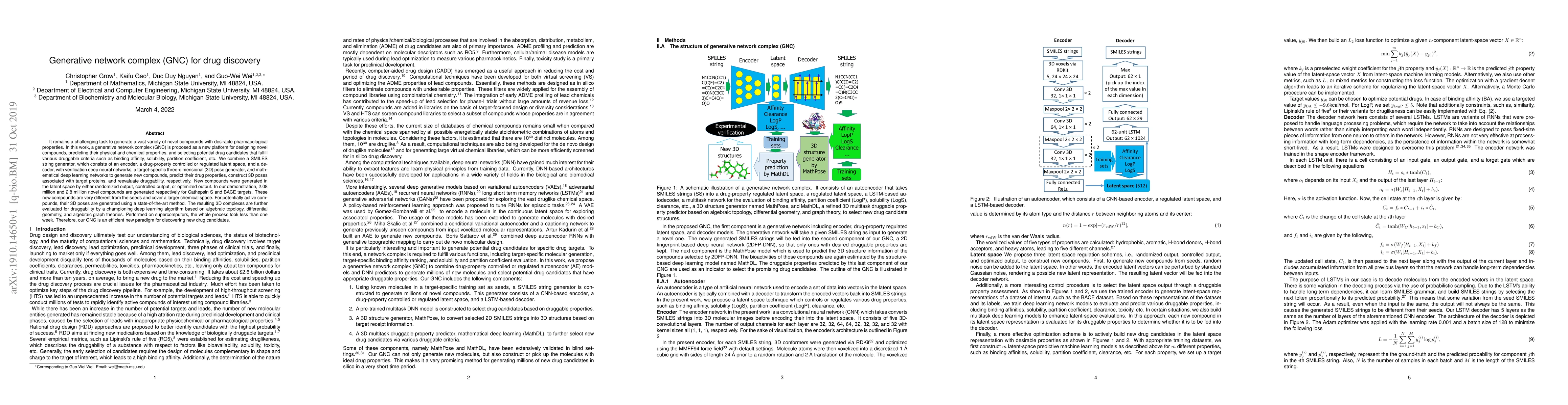 It remains a challenging task to generate a vast variety of novel compounds with desirable pharmacological properties. In this work, a generative network complex (GNC) is proposed as a new platform for designing novel compounds, predicting their physical and chemical properties, and selecting potential drug candidates that fulfill various druggable criteria such as binding affinity, solubility, partition coefficient, etc. We combine a SMILES string generator, which consists of an encoder, a drug-property controlled or regulated latent space, and a decoder, with verification deep neural networks, a target-specific three-dimensional (3D) pose generator, and mathematical deep learning networks to generate new compounds, predict their drug properties, construct 3D poses associated with target proteins, and reevaluate druggability, respectively. New compounds were generated in the latent space by either randomized output, controlled output, or optimized output. In our demonstration, 2.08 million and 2.8 million novel compounds are generated respectively for Cathepsin S and BACE targets. These new compounds are very different from the seeds and cover a larger chemical space. For potentially active compounds, their 3D poses are generated using a state-of-the-art method. The resulting 3D complexes are further evaluated for druggability by a championing deep learning algorithm based on algebraic topology, differential geometry, and algebraic graph theories. Performed on supercomputers, the whole process took less than one week. Therefore, our GNC is an efficient new paradigm for discovering new drug candidates.