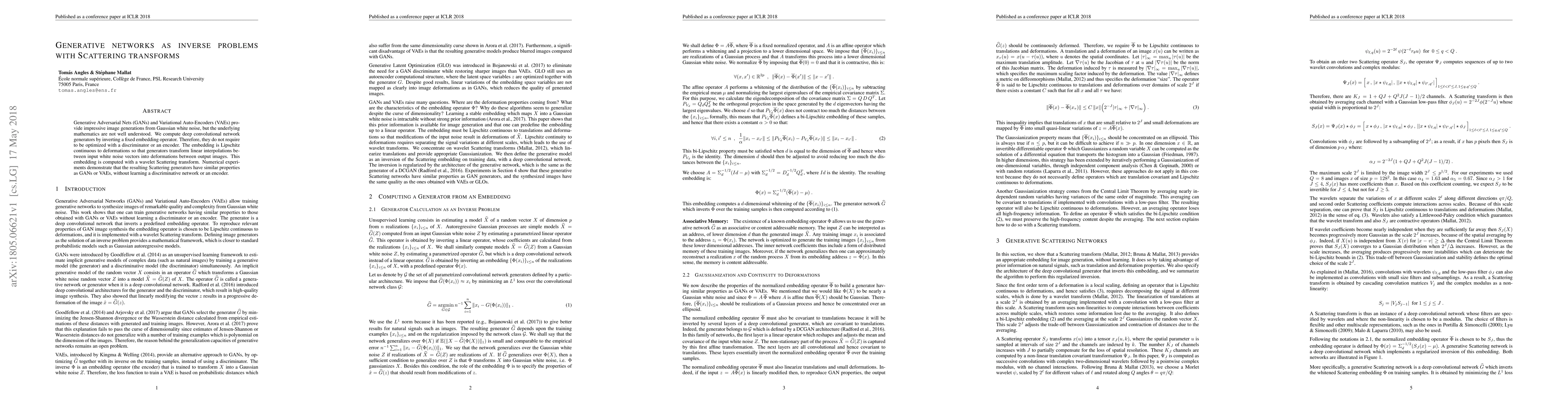 This paper proposes a novel approach to generative networks by framing them as inverse problems solved using Scattering transforms. It demonstrates that deep convolutional network generators can be derived by inverting a Lipschitz continuous embedding operator, thus achieving similar generative capabilities as GANs and VAEs without requiring optimization through a discriminator or encoder.