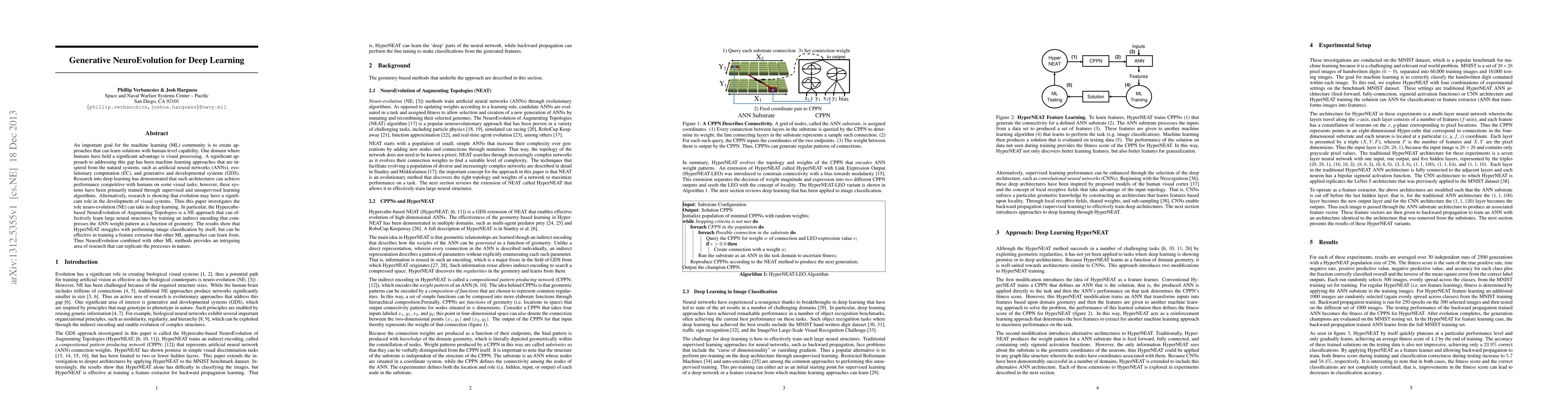 An important goal for the machine learning (ML) community is to create approaches that can learn solutions with human-level capability. One domain where humans have held a significant advantage is visual processing. A significant approach to addressing this gap has been machine learning approaches that are inspired from the natural systems, such as artificial neural networks (ANNs), evolutionary computation (EC), and generative and developmental systems (GDS). Research into deep learning has demonstrated that such architectures can achieve performance competitive with humans on some visual tasks; however, these systems have been primarily trained through supervised and unsupervised learning algorithms. Alternatively, research is showing that evolution may have a significant role in the development of visual systems. Thus this paper investigates the role neuro-evolution (NE) can take in deep learning. In particular, the Hypercube-based NeuroEvolution of Augmenting Topologies is a NE approach that can effectively learn large neural structures by training an indirect encoding that compresses the ANN weight pattern as a function of geometry. The results show that HyperNEAT struggles with performing image classification by itself, but can be effective in training a feature extractor that other ML approaches can learn from. Thus NeuroEvolution combined with other ML methods provides an intriguing area of research that can replicate the processes in nature.