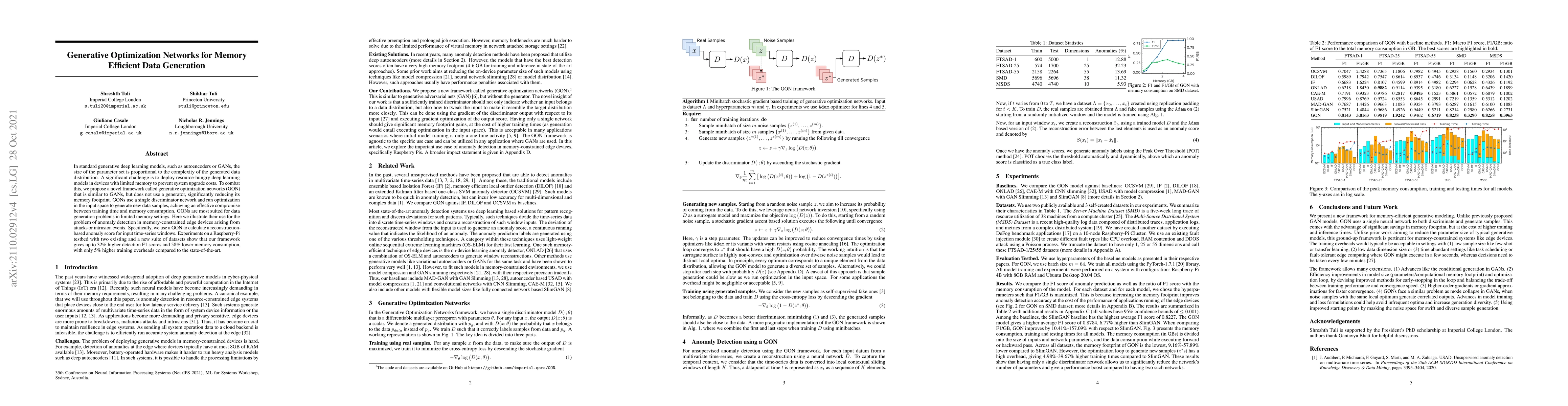 A new framework called Generative Optimization Networks (GON) offers a memory-efficient approach to data generation, achieving up to 32% higher detection F1 scores in anomaly detection tasks with 58% lower memory consumption.