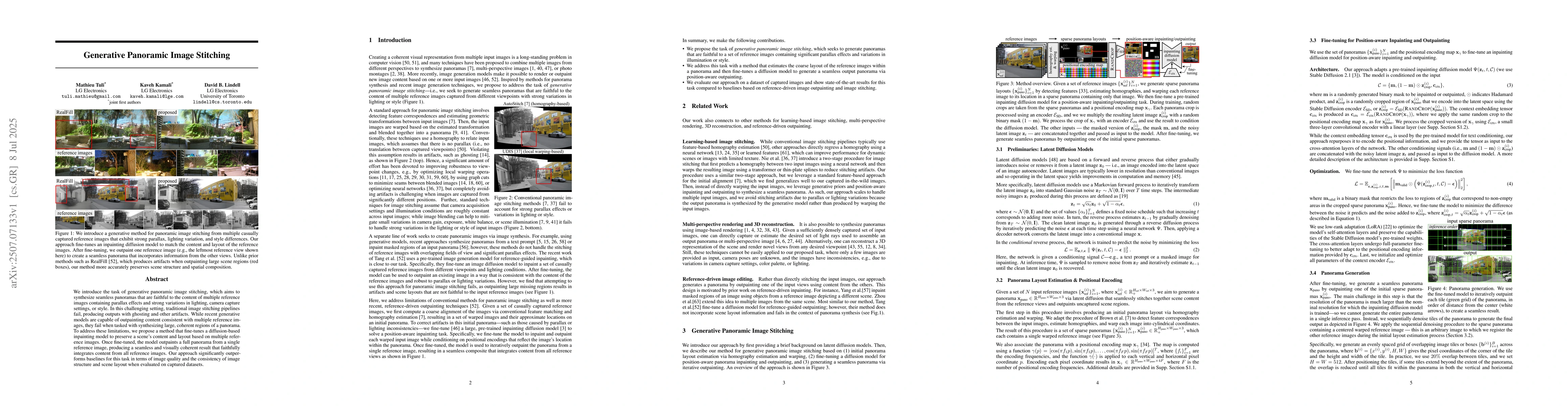 We introduce the task of generative panoramic image stitching, which aims to synthesize seamless panoramas that are faithful to the content of multiple reference images containing parallax effects and strong variations in lighting, camera capture settings, or style. In this challenging setting, traditional image stitching pipelines fail, producing outputs with ghosting and other artifacts. While recent generative models are capable of outpainting content consistent with multiple reference images, they fail when tasked with synthesizing large, coherent regions of a panorama. To address these limitations, we propose a method that fine-tunes a diffusion-based inpainting model to preserve a scene's content and layout based on multiple reference images. Once fine-tuned, the model outpaints a full panorama from a single reference image, producing a seamless and visually coherent result that faithfully integrates content from all reference images. Our approach significantly outperforms baselines for this task in terms of image quality and the consistency of image structure and scene layout when evaluated on captured datasets.