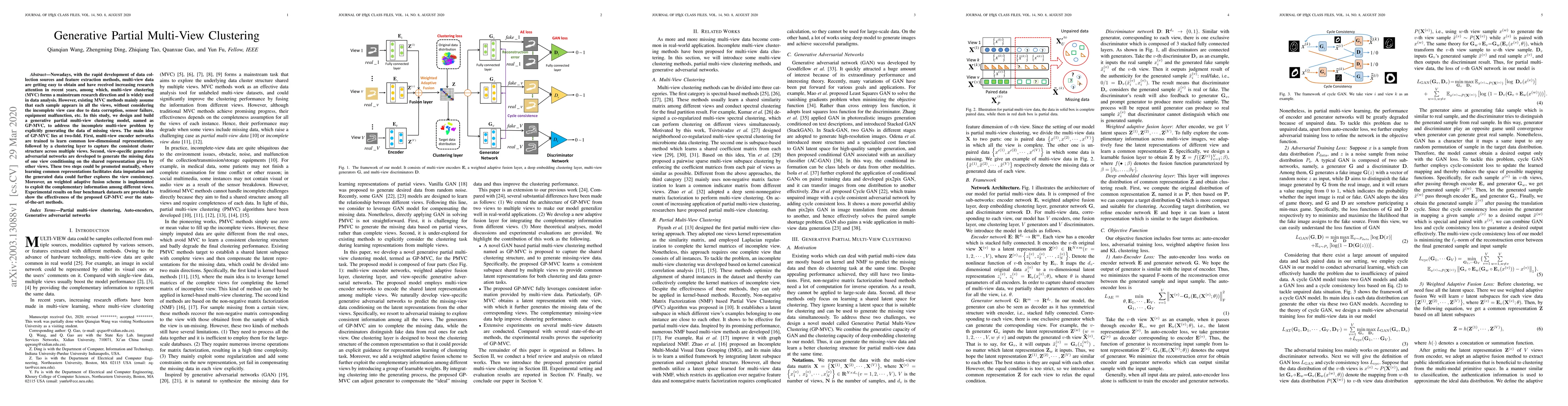 This paper proposes a generative partial multi-view clustering model, GP-MVC, to address incomplete multi-view data issues by generating missing data through view-specific GANs. The model employs encoder networks to learn common representations and a clustering layer to capture consistent cluster structures, while a weighted adaptive fusion scheme exploits complementary information across views.