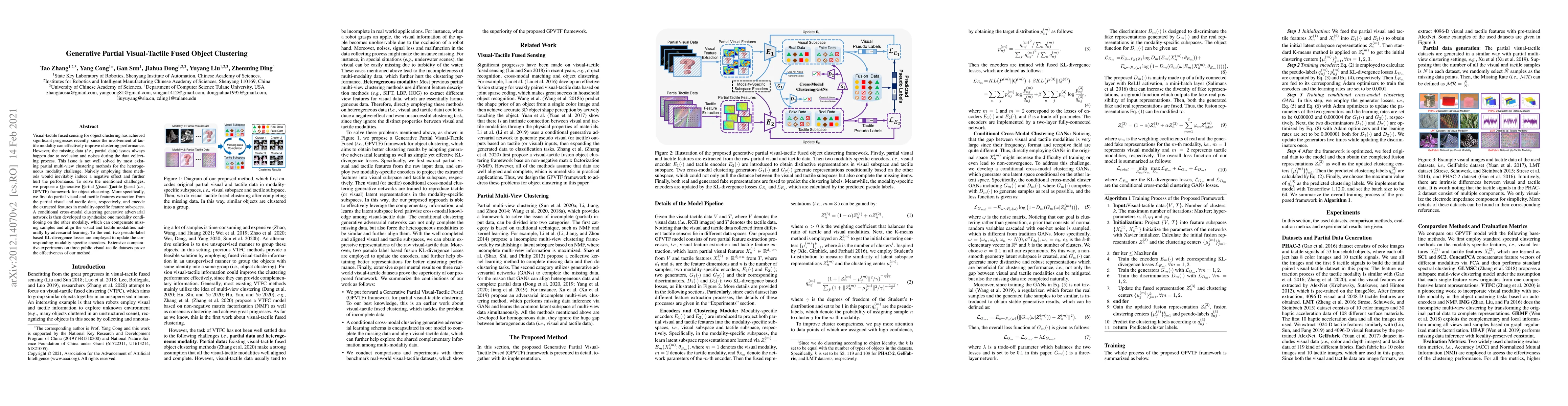 This paper proposes a Generative Partial Visual-Tactile Fused (GPVTF) framework for object clustering, addressing the challenge of missing data in visual-tactile fused sensing. It employs a conditional GAN to synthesize missing data and align modalities, improving clustering performance.